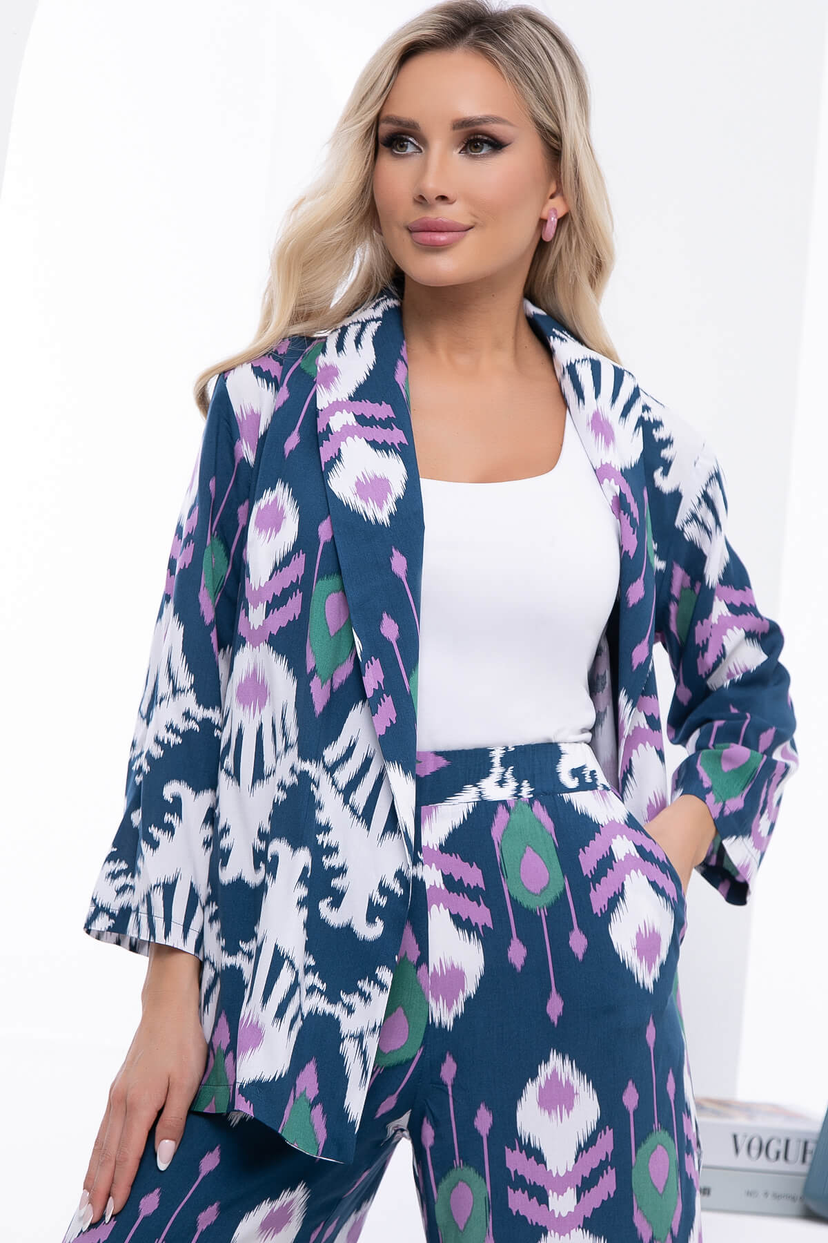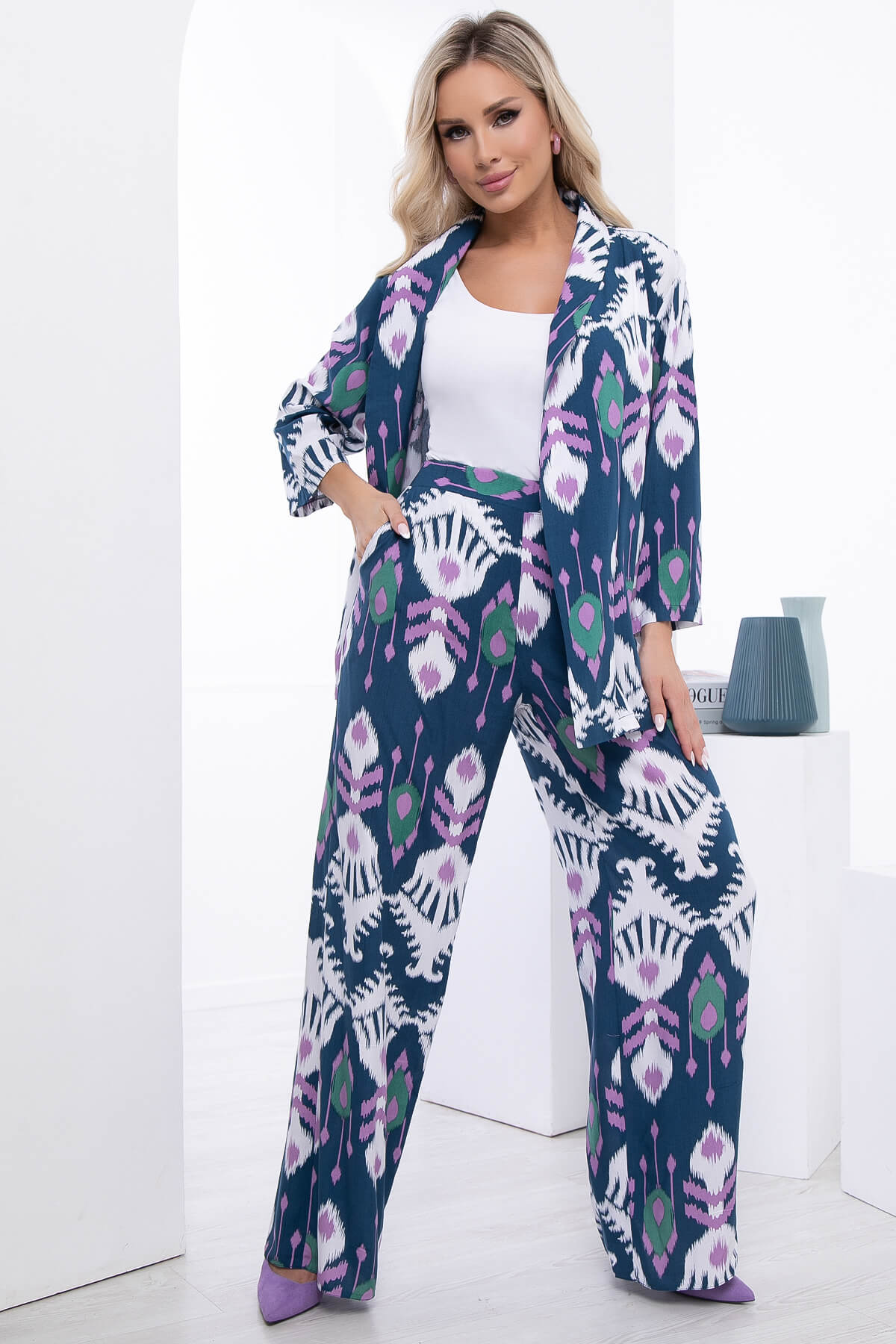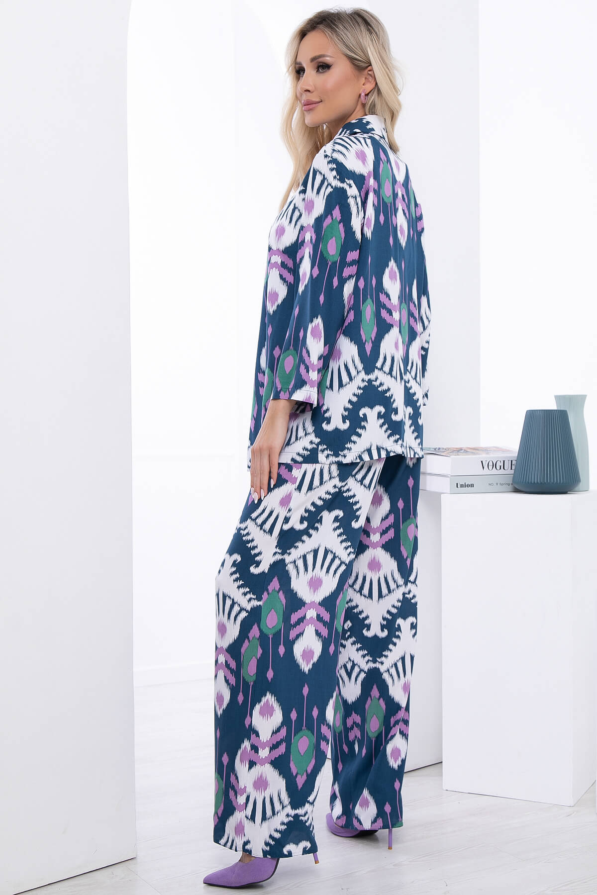 Костюм из лёгкой ткани идеально подойдёт для летнего расслабленного образа. Свободный крой не сковывает движений и дарит комфорт. Рукав три четверти, со спущенным плечевым швом.В комплект входит пояс из основной ткани, который позволит подчеркнуть преимущества фигуры.