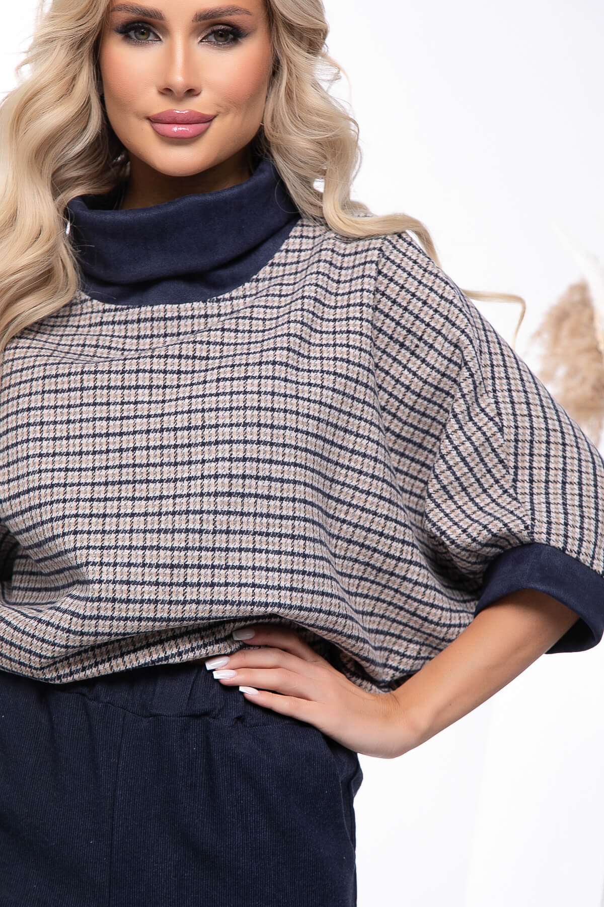 Костюм-двойка, состоящий из классических брюк прямого кроя и джемпера свободного кроя. Преимущество комплекта в том, что Вы сможете самостоятельно носить как джемпер, так и брюки. В повседневном образе смело сочетайте с лоферами или ботинками, а если нужен более официальный образ - то с туфлями на каблуке. Костюм выполнен из плотной костюмной ткани. Акцентом данной модели является пройма рукава - "Летучая мышь".
