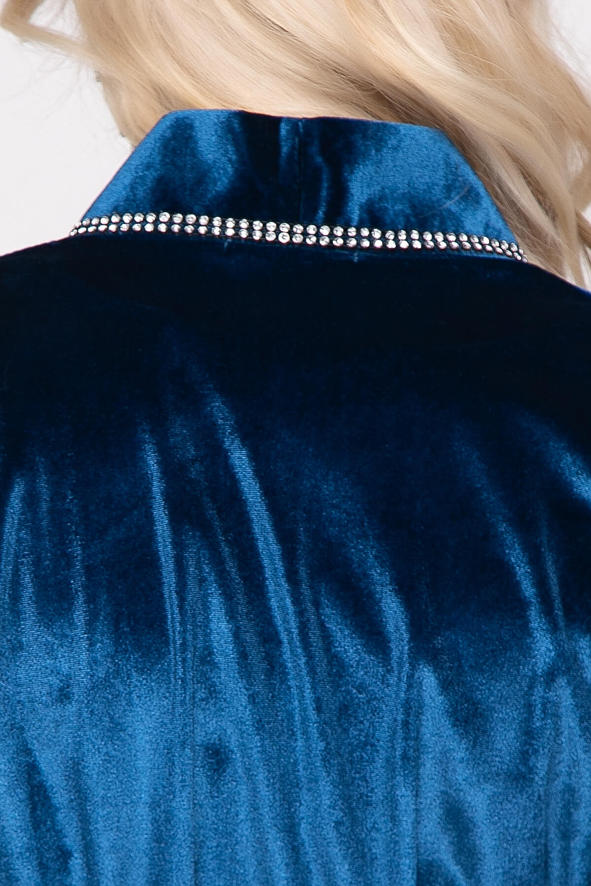 Роскошный бархатный костюм в стильном оттенке. Богемный лоск этой новинки просто сводит с ума! Шикарные брюки с высокой посадкой не просто идеально смотрятся на фигуре, но и создают полное ощущение комфорта благодаря своему крою и мягкости материала. Рукав втачной, три четверти. Жакет украшен стразами, что делает образ более праздничным. В комплект входит пояс из основной ткани.
