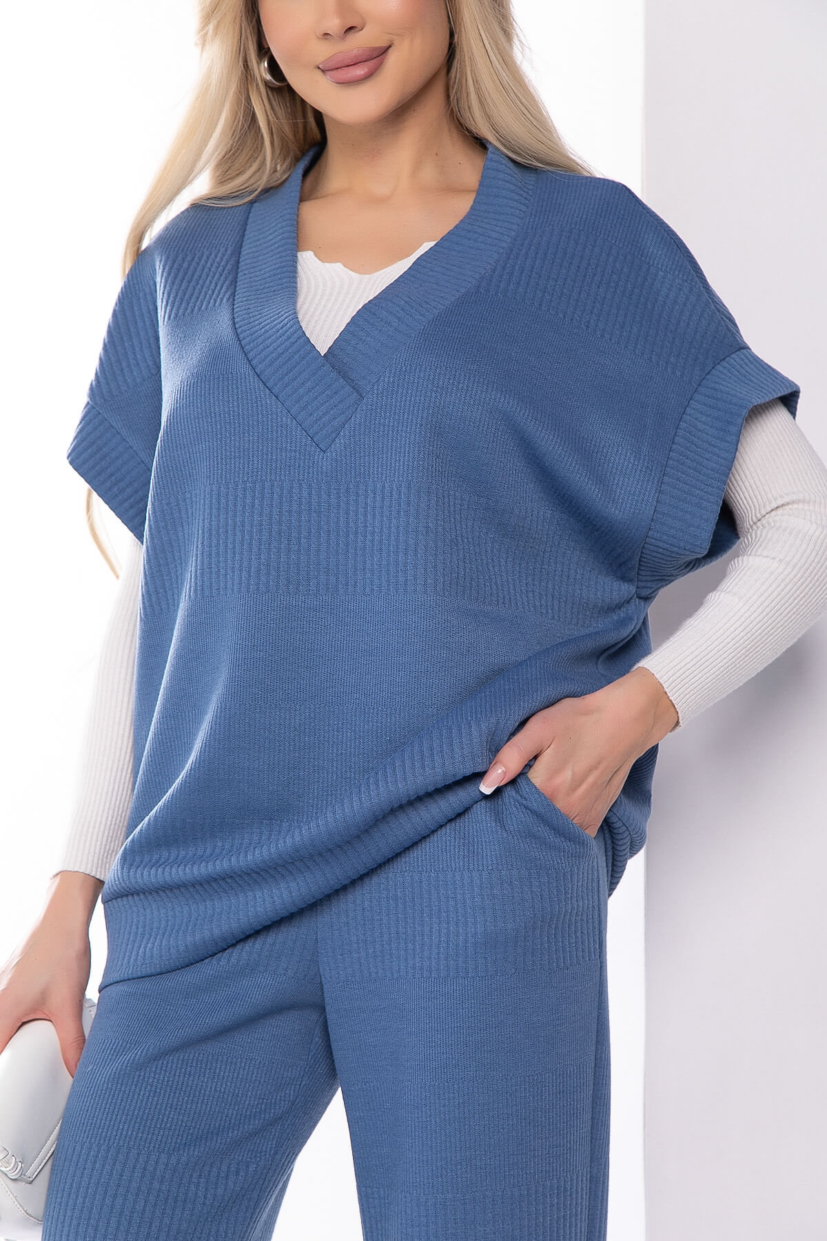 Костюм-двойка, состоящий из прямых брюк с высокой посадкой на резинке и жилета свободного кроя. Преимущество комплекта в том, что вы сможете самостоятельно носить как жакет, так и брюки. В повседневном образе смело сочетайте с лоферами или ботинками, а если нужен более официальный образ, с туфлями на каблуке.
