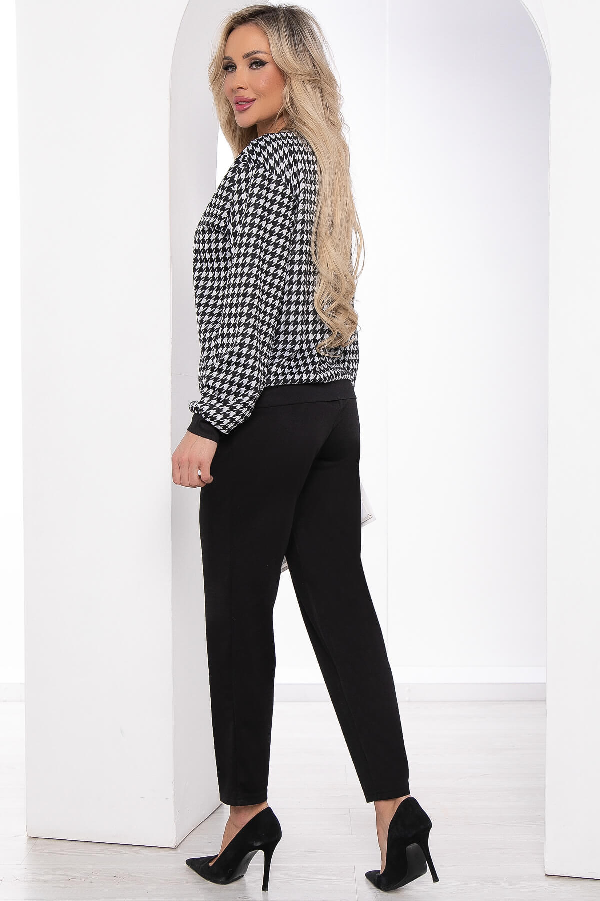 Костюм-двойка, состоящий из классических брюк прямого кроя и свободного жакета с принтом гусиная лапка. V-образный вырез горловины дополнен акцентным элементом, что придает образу легкий спортивный стиль. Брюки по талии на резинке, в боковых швах жакета есть карманы. В таком костюме можно смело отправиться на прогулку или на встречу с друзьями.
