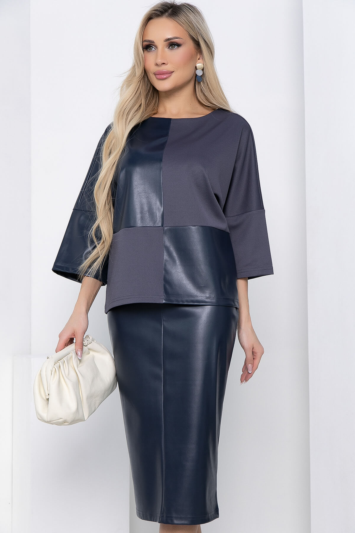 Нарядно-повседневный костюм из сочетания двух фактур трикотажа и экокожи комфортно сядет на любую фигуру. Элегантный юбочный костюм будет идеальным вариантом для прогулок, деловых встреч, работы в офисе. Также женский костюм отлично подойдет и для торжественных мероприятий. Универсальный костюм сочетается с туфлями, сапогами и даже с кроссовками. Блузка свободного кроя с рукавом 3/4. Классическая юбка-карандаш чуть ниже колена, талия на резинке.
