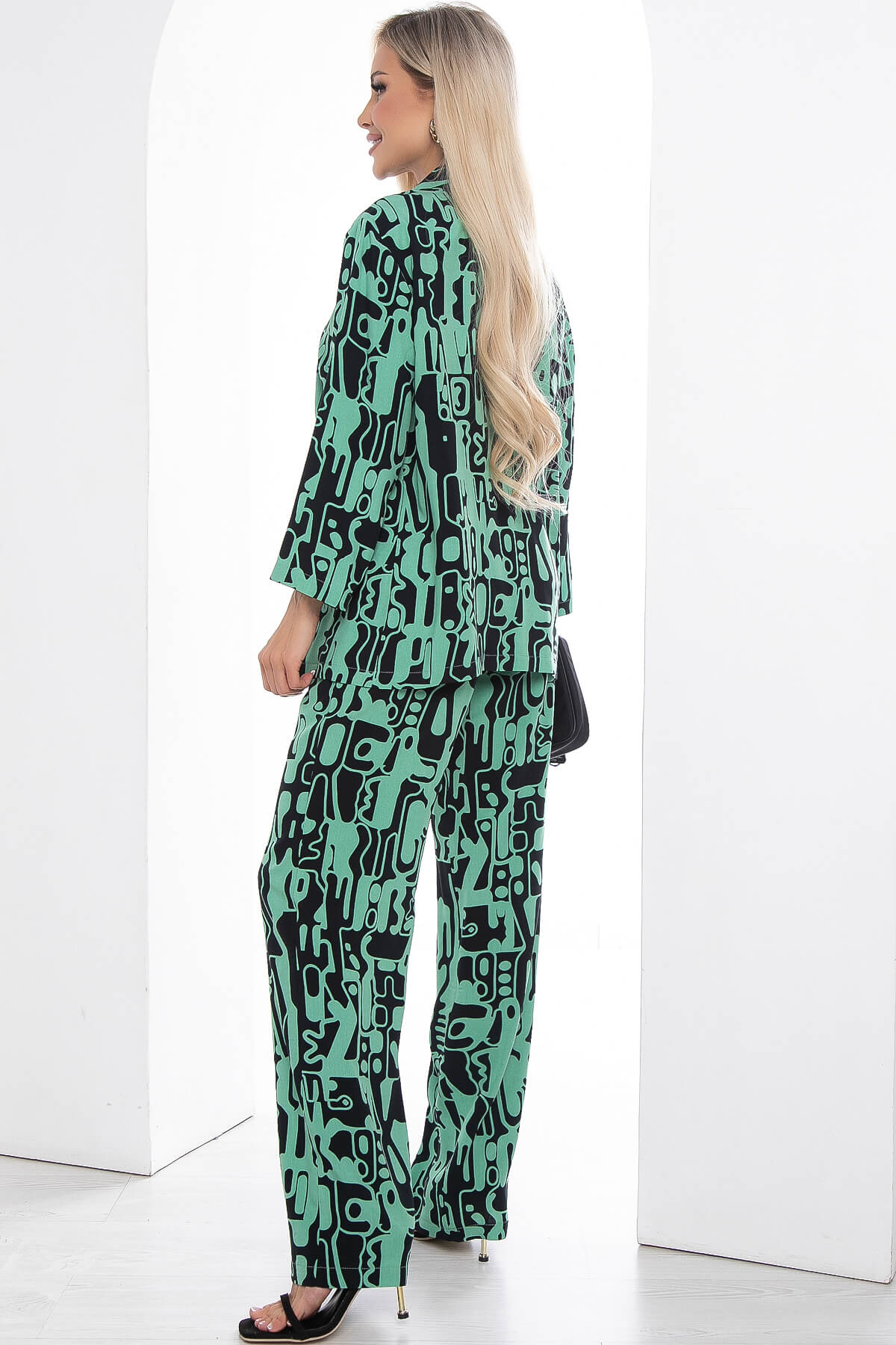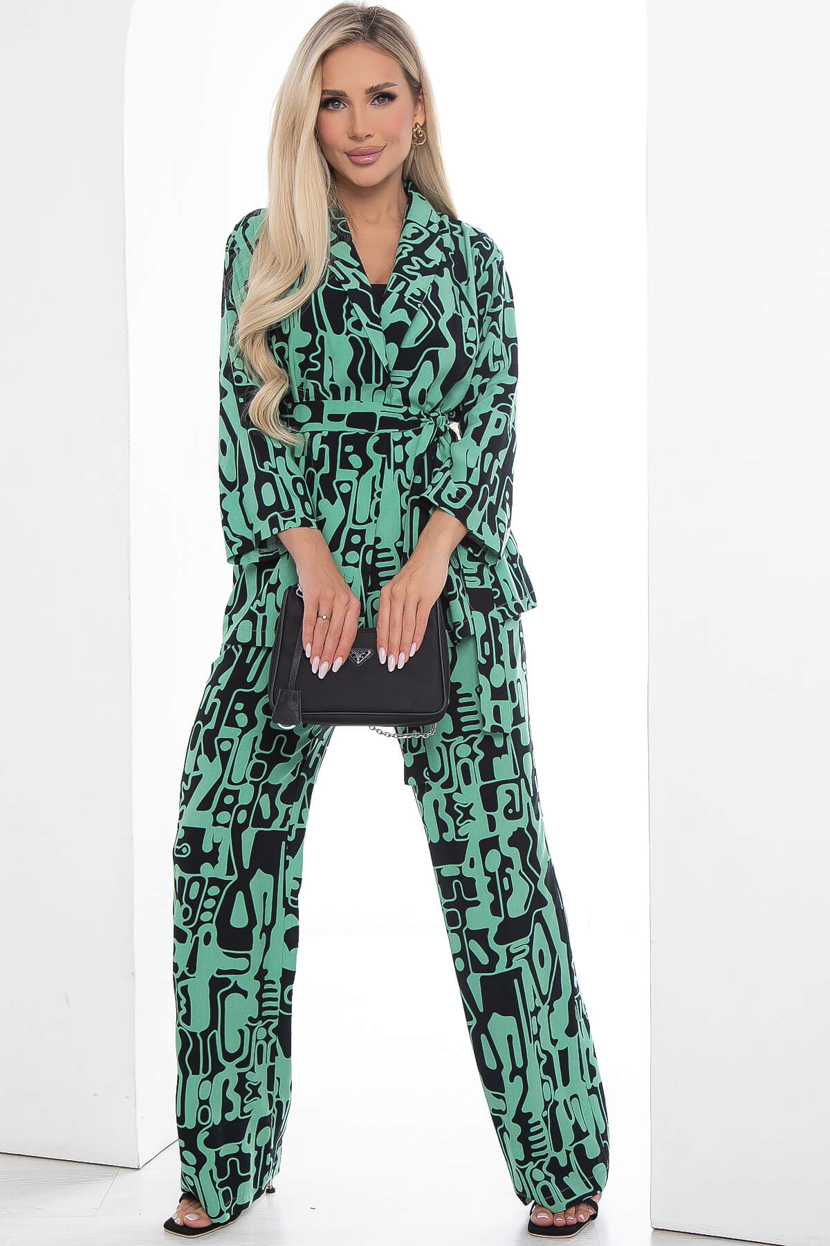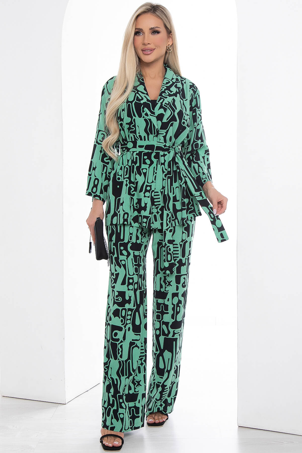 Костюм из лёгкой ткани идеально подойдёт для летнего расслабленного образа. Свободный крой не сковывает движений и дарит комфорт. Рукав три четверти, со спущенным плечевым швом. В комплект входит пояс из основной ткани, который позволит подчеркнуть преимущества фигуры.