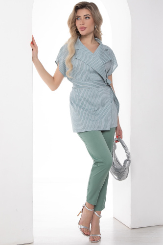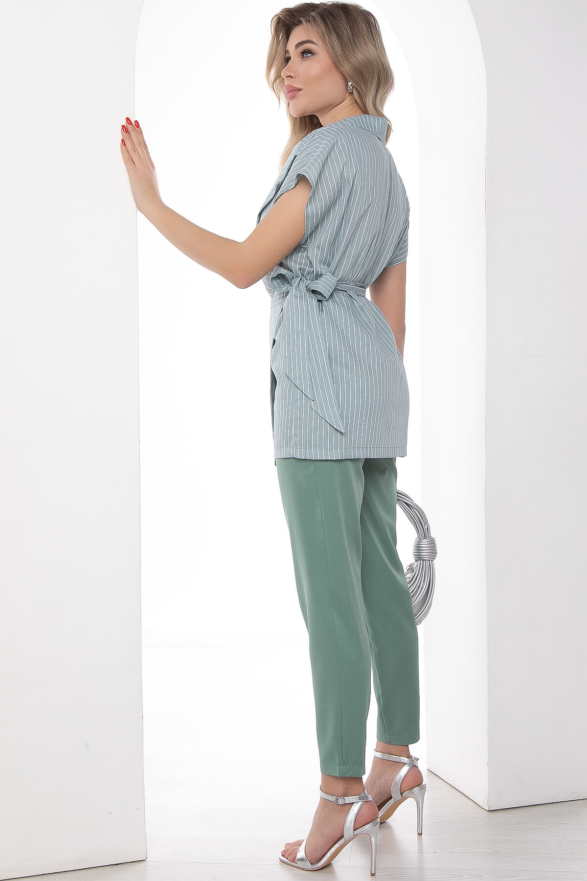 Стильная новинка поможет создать вам неповторимый образ для любого случая! Подойдет как для повседневного образа, так и для деловой встречи. Костюм-двойка состоит из брюк и блузы прямого кроя. Блуза, скроенная на запах имеет характерный V-образный вырез горловины, красиво подчёркивающий зону декольте, и короткий рукав. Блуза оснащена пришивным поясом.