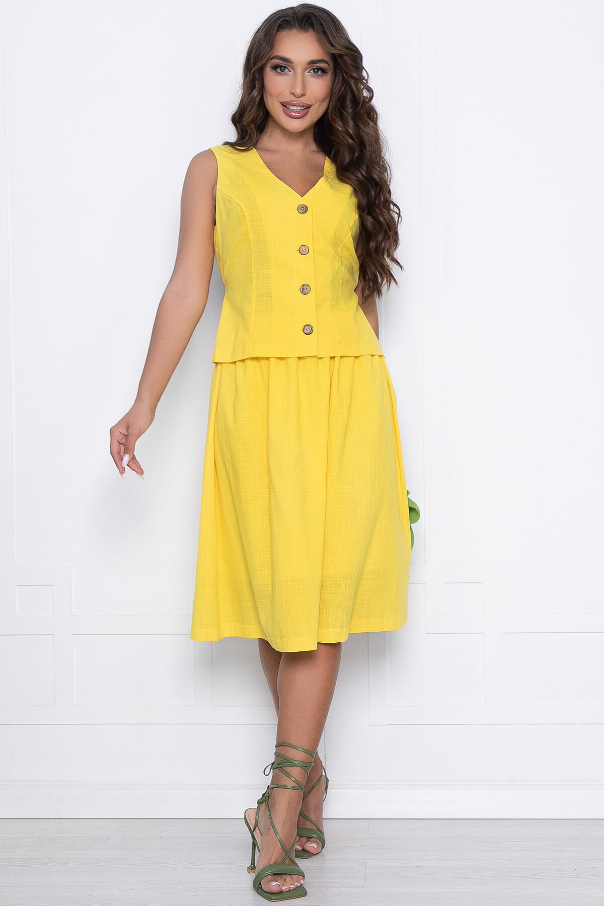 Костюм представляет собой комплект из жилета и юбки, который станет прекрасным дополнением в ваш летний гардероб! Такой комплект позволит создать повседневный и элегантный образ. Можно сочетать с другими элементами одежды. Верх на пуговицах без рукавов. Юбка длиной миди, талия на резинке, есть подкладка.