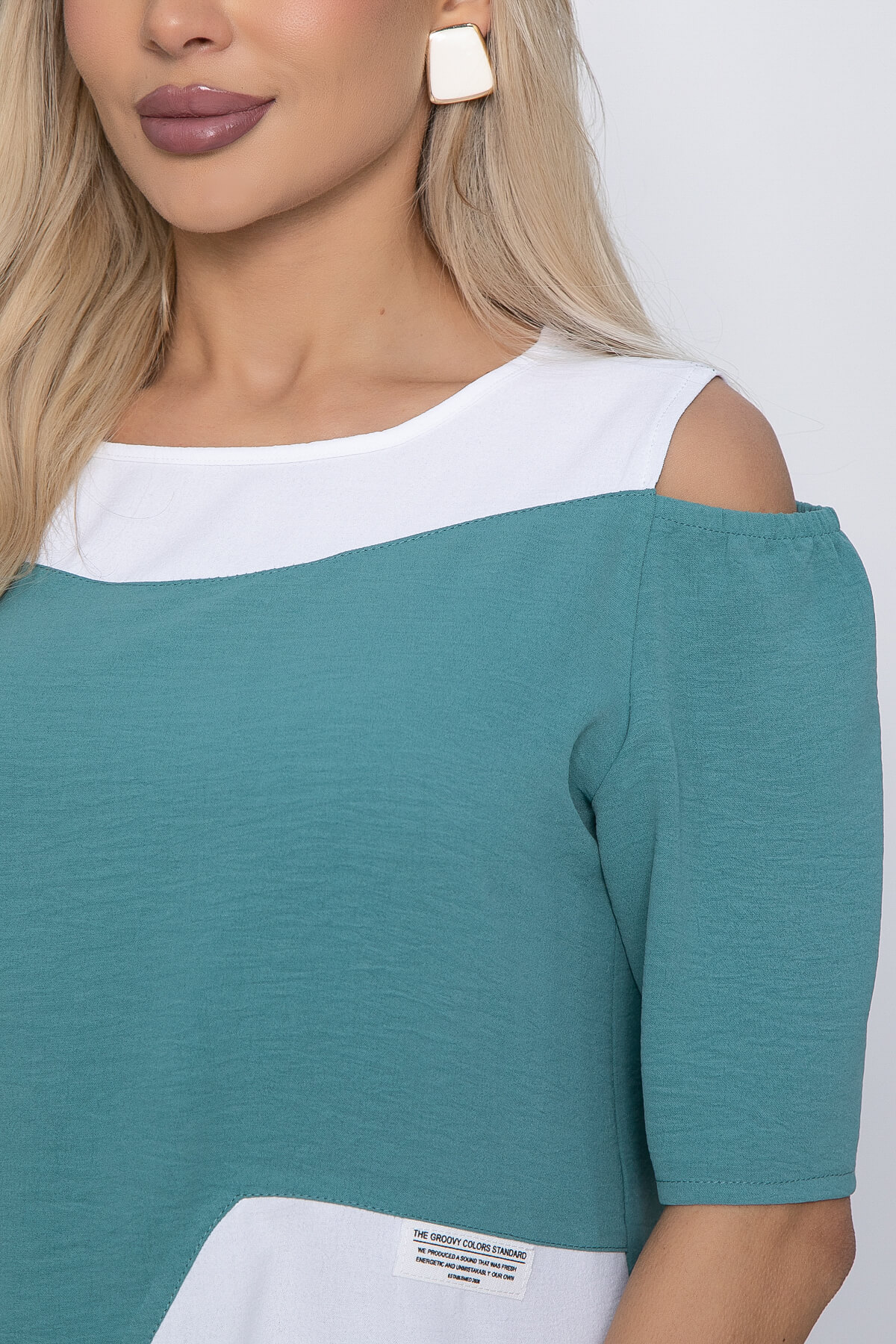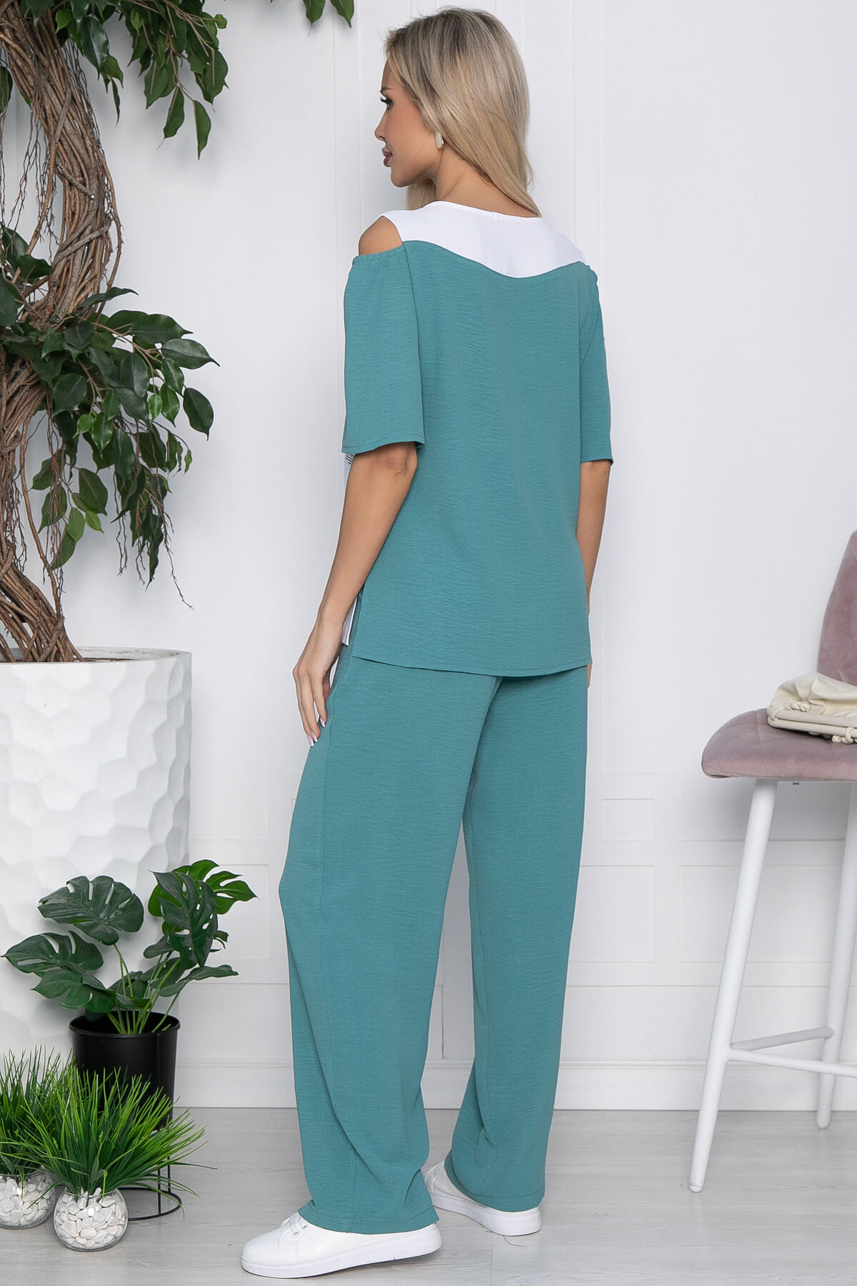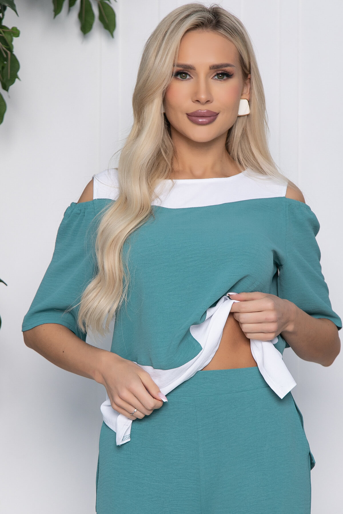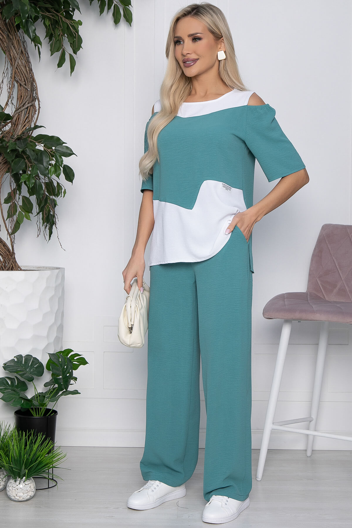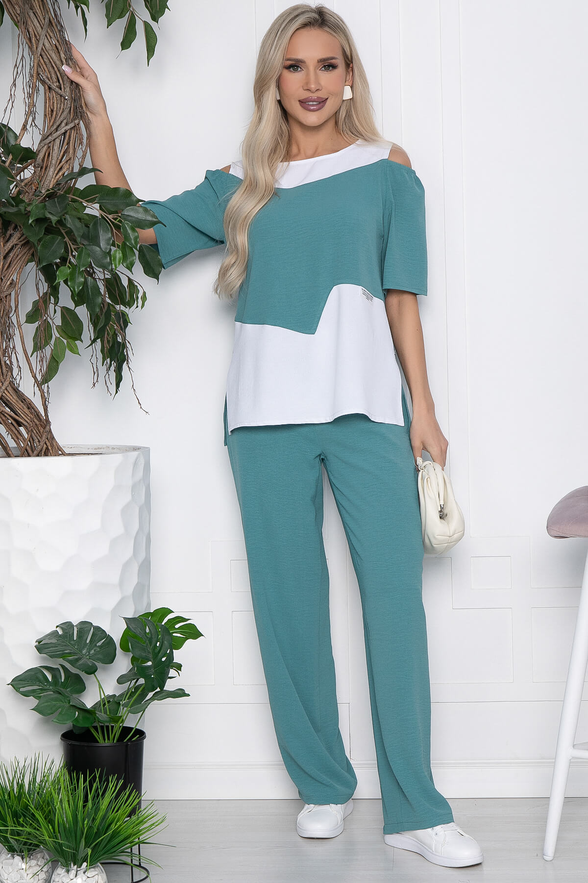 Универсальный, лёгкий и стильный брючный комплект, состоящий из свободной блузы и прямых брюк. Блузка двух цветов с фигурной средней частью по переду, с разрезами по бокам. Рукава с вырезами на плечах не оставят без внимания окружающих. Брюки по талии на резинке обеспечивают идеальную посадку, по бокам расположены карманы. Свободный крой костюма позволяет чувствовать себя комфортно, прекрасно сочетается с обувью на плоской подошве и каблучке.
