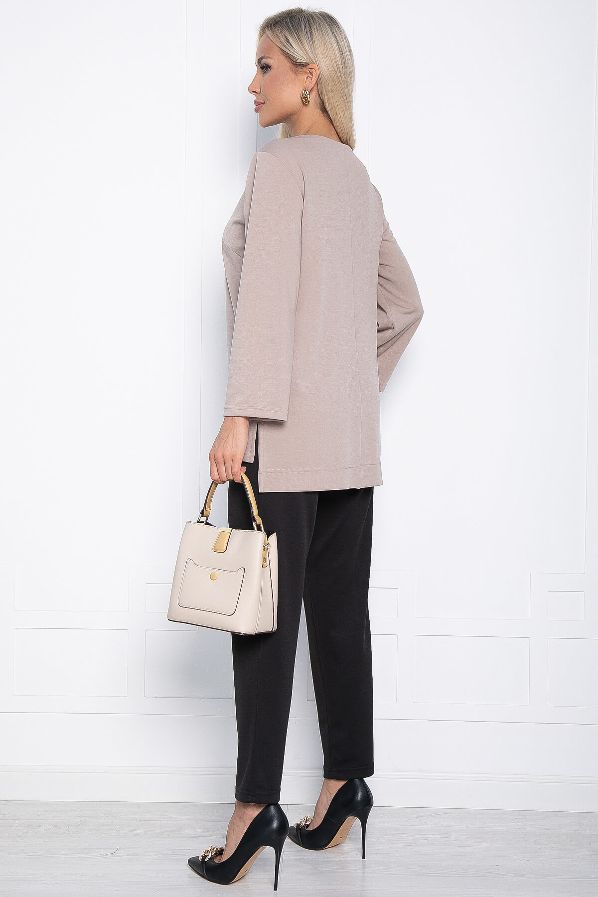 Создайте идеальный образ с новым костюмом из трикотажа с акцентной цепочкой на груди. Брюки удобного кроя по талии оснащены резинкой. Джемпер свободного кроя оформлен дополнительно украшением. Такой костюм прекрасно подойдёт для создания повседневного или делового образа.