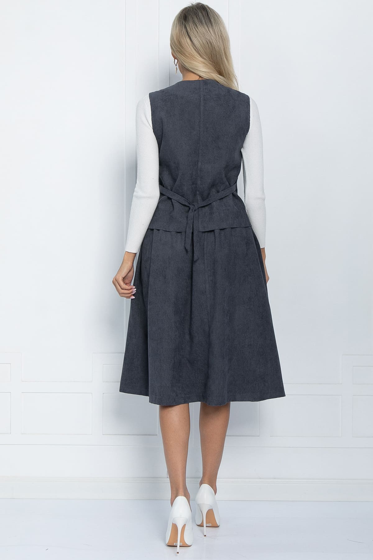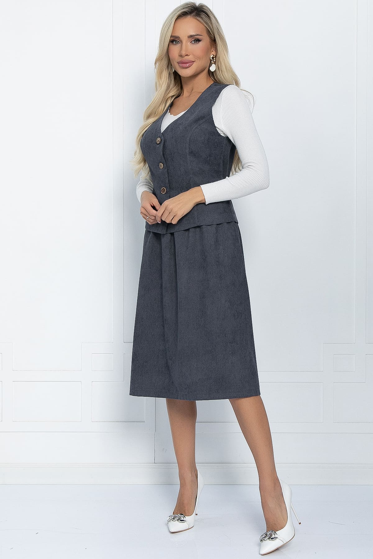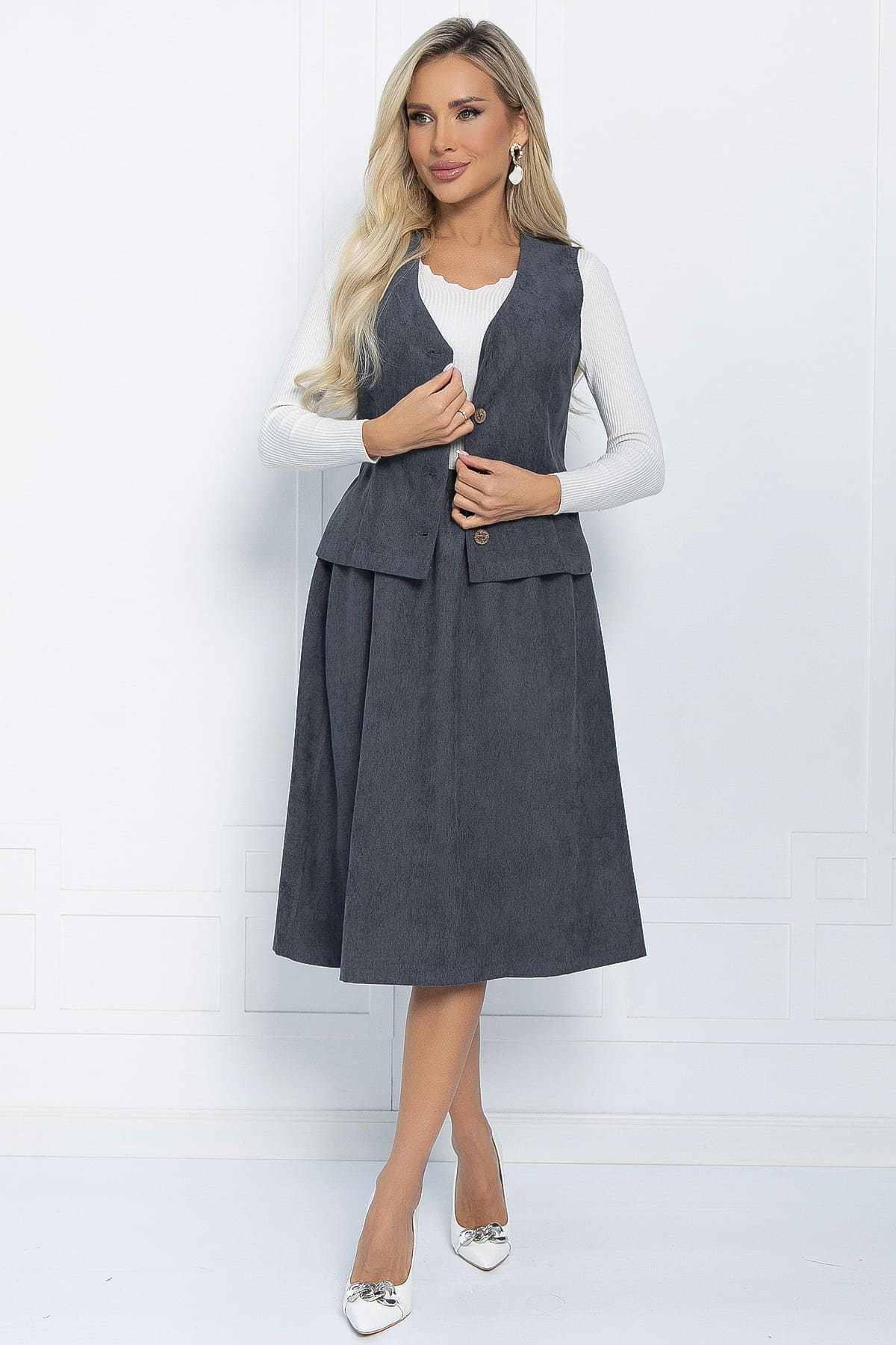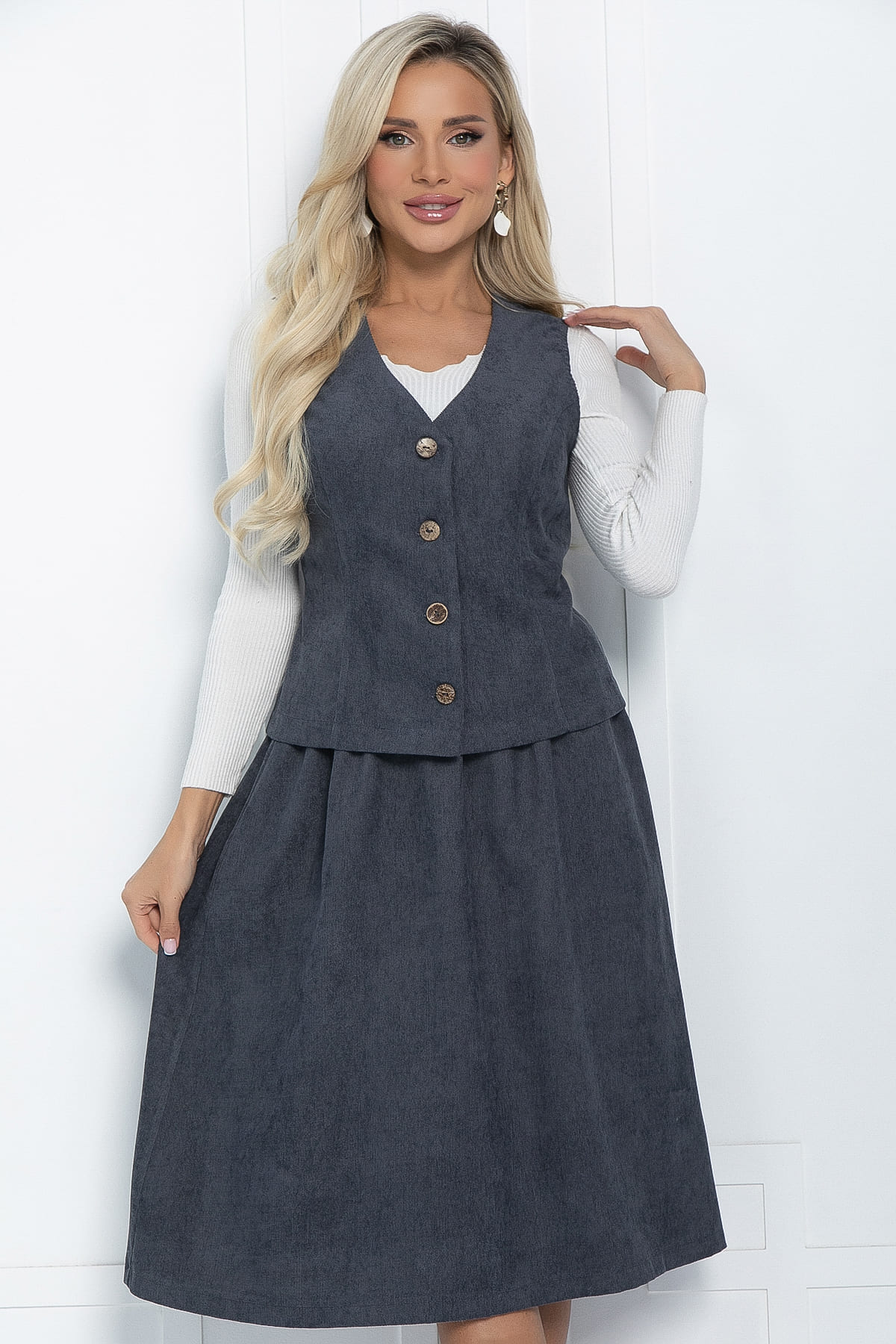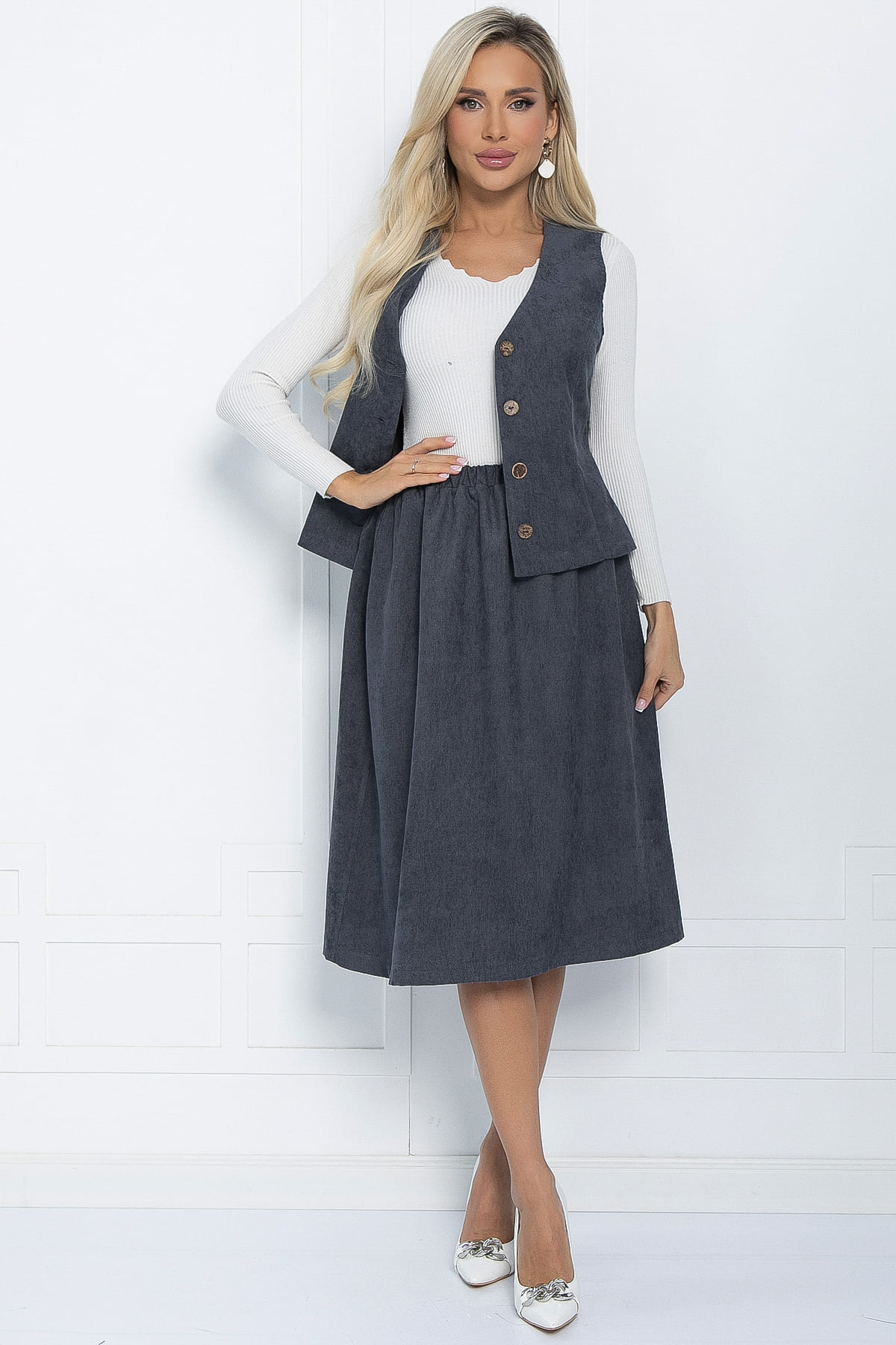 Костюм премиум класса из жилета и юбки, который станет прекрасным дополнением в ваш базовый гардероб! Такой комплект будет отлично смотреться как на деловой встрече, так и на вечеринке или прогулке, добавляя выразительности и строгости в образ. Вельветовый костюм с юбкой и жилетом — это стильный и элегантный наряд, который сочетает в себе классику и современность. Верх на пуговицах без рукавов. Юбка длиной миди, без подкладки.