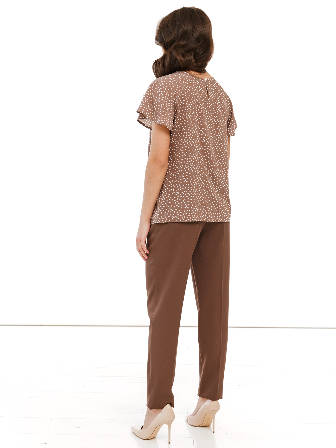 Костюм является одним из чувственных образов этой весны. Носить такое изделие можно не только в офис. Изысканный комплект идеально впишется в романтический и деловой стиль одежды! Комплект состоит из двух изделий - классических брюк и блузы. Блуза свободного кроя из легкой ткани в яркий принт "горох" с интересным и летящим коротким рукавом. По переду оформлена декоративными завязками, которые можно сформировать в красивый бант.