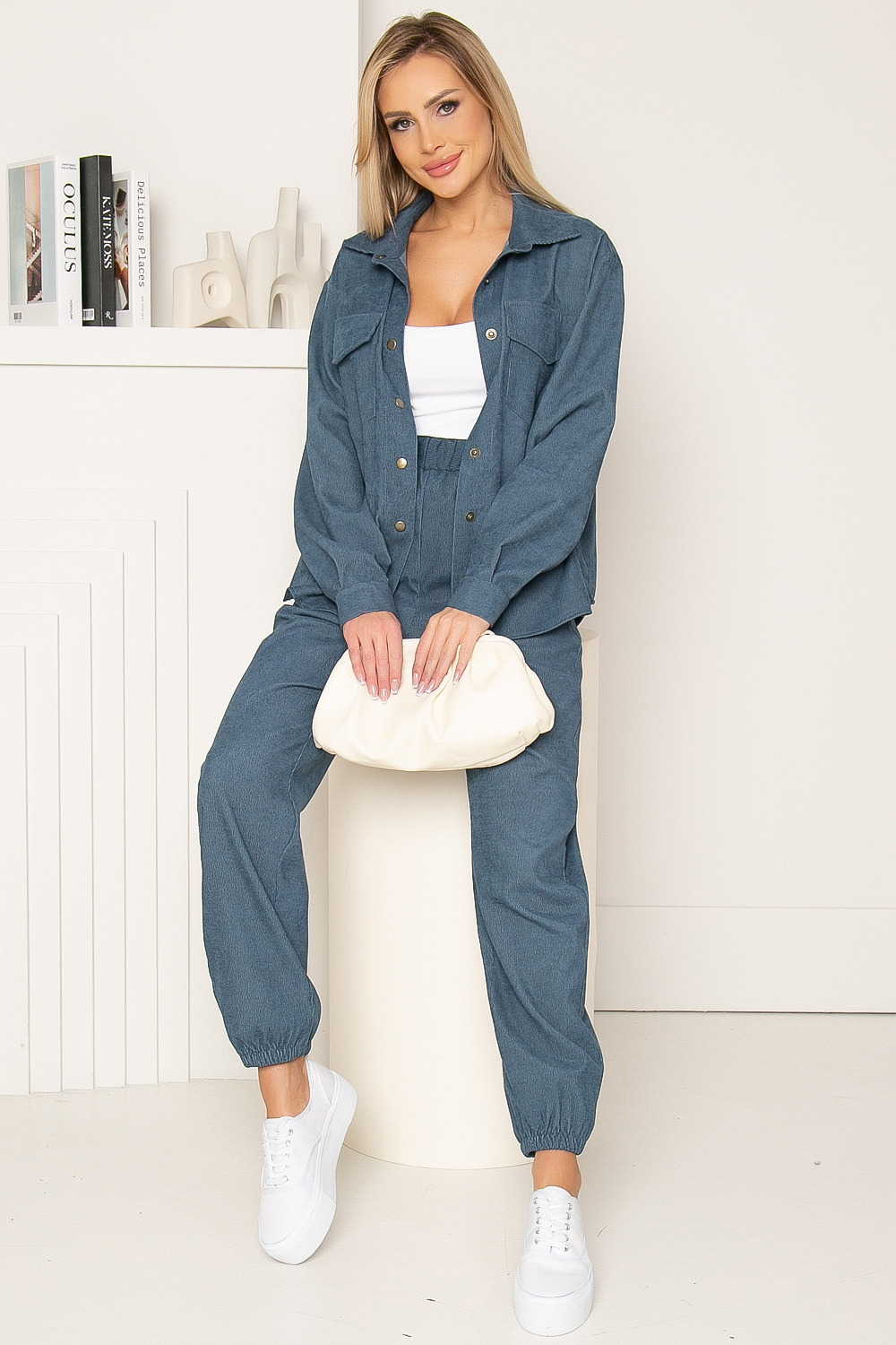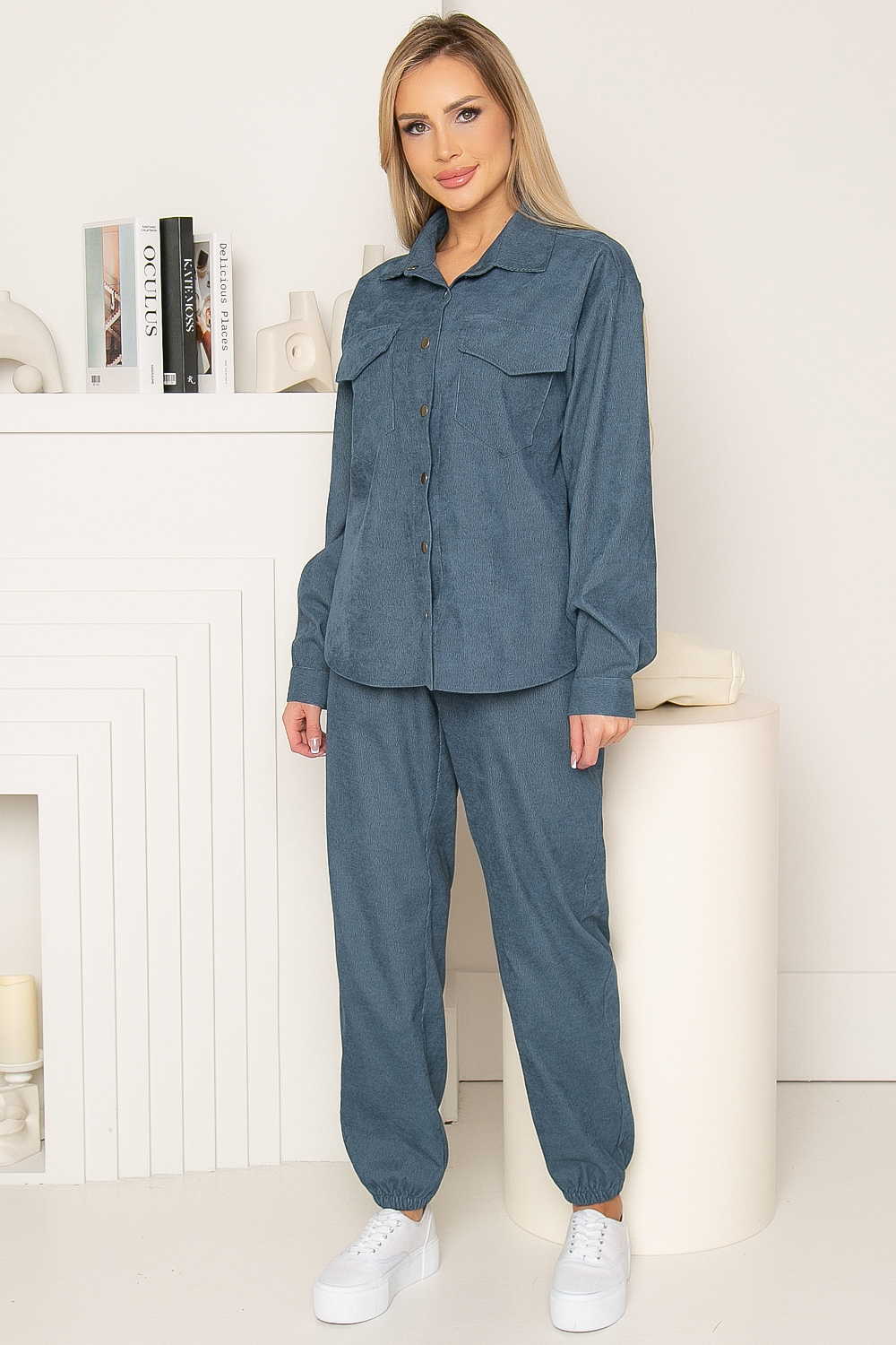 Костюм из вельвета - необычное решение для Вашего модного гардероба! Брюки-джоггеры настоящий маст-хэв 2022 года! Для сохранения тепла в прохладную погоду, наденьте под рубашку топ или футболку. Стильно смотрится с туфлями на высоком каблуке, для более городского образа - подойдут кроссовки или лоферы. Брюки на резинке, в боковых швах расположены удобные карманы, низ так же собран на резинку. Рубашка свободного кроя с отложным воротничком, на кнопках, на груди функциональные карманы с клапаном. Низ рубашки закруглен, спинка удлинена. Рукав длинный, втачной, манжет застёгивается на кнопку.