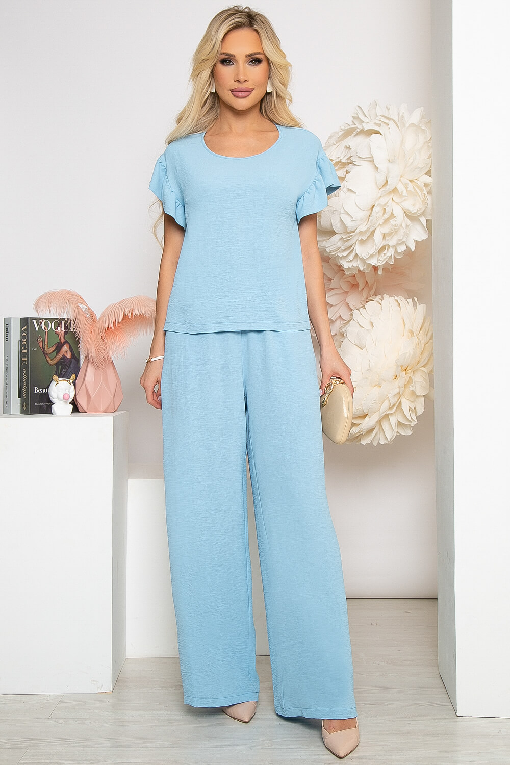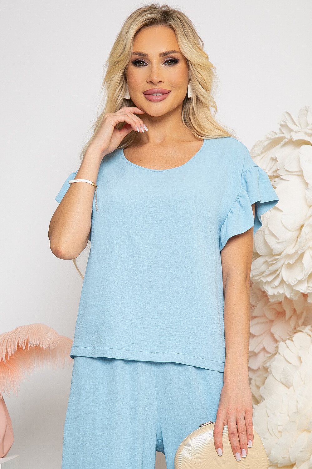 Блуза: прямой крой, вырез горловины - округлый, пройма оформлена оборкой-крылышком.
