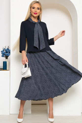 Безупречный стиль - это, в первую очередь, внимание к деталям. Костюм двойка, состоящий из блузы и юбки в классическом синем оттенке с принтом "Горошек" станет украшением Вашего делового гардероба. Совершенство линий, струящаяся ткань юбки и декоративный элемент - шарфик подарят лёгкую загадочность Вашему образу. Блуза свободного кроя, рукав втачной, три четверти, по бокам разрезы. Юбка А-силуэта, на резинке по талии.
