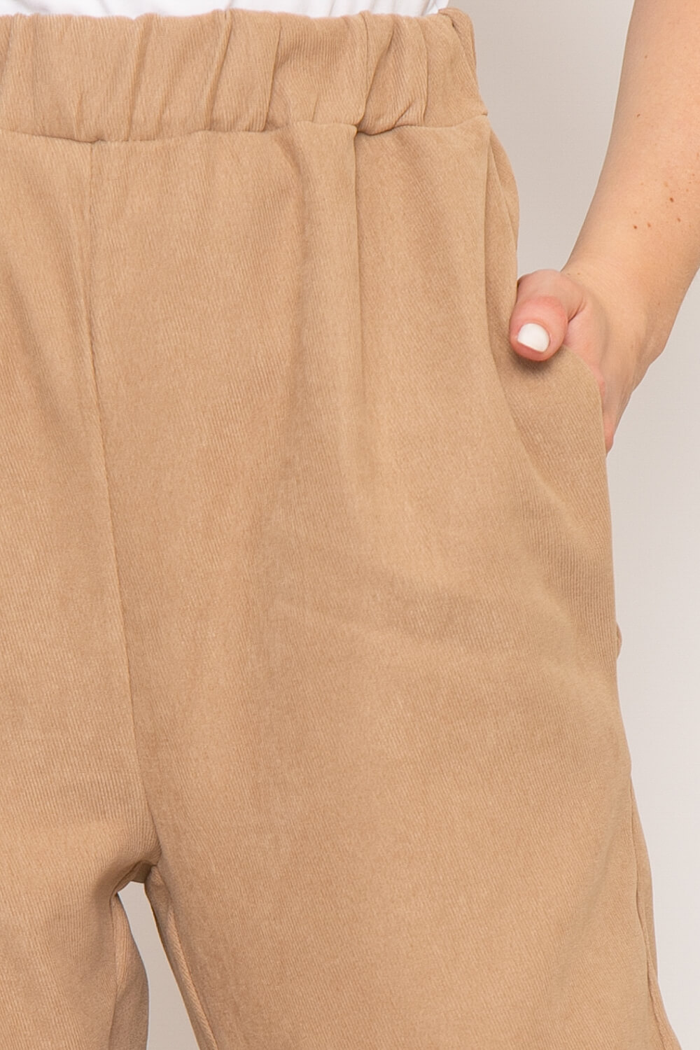 Костюм из вельвета - настоящий маст-хэв осенне-зимнего сезона! Для сохранения тепла в прохладную погоду, наденьте под рубашку топ или футболку. Стильно смотрится с туфлями на высоком каблуке, для более расслабленного образа - подойдут кроссовки или лоферы. Брюки на резинке, в боковых швах расположены удобные карманы, низ так же собран на резинку. Рубашка свободного кроя с отложным воротничком, на кнопках, на груди функциональные карманы с клапаном. Низ рубашки закруглен, спинка удлинена. Рукав длинный, втачной, манжет застёгивается на кнопку.