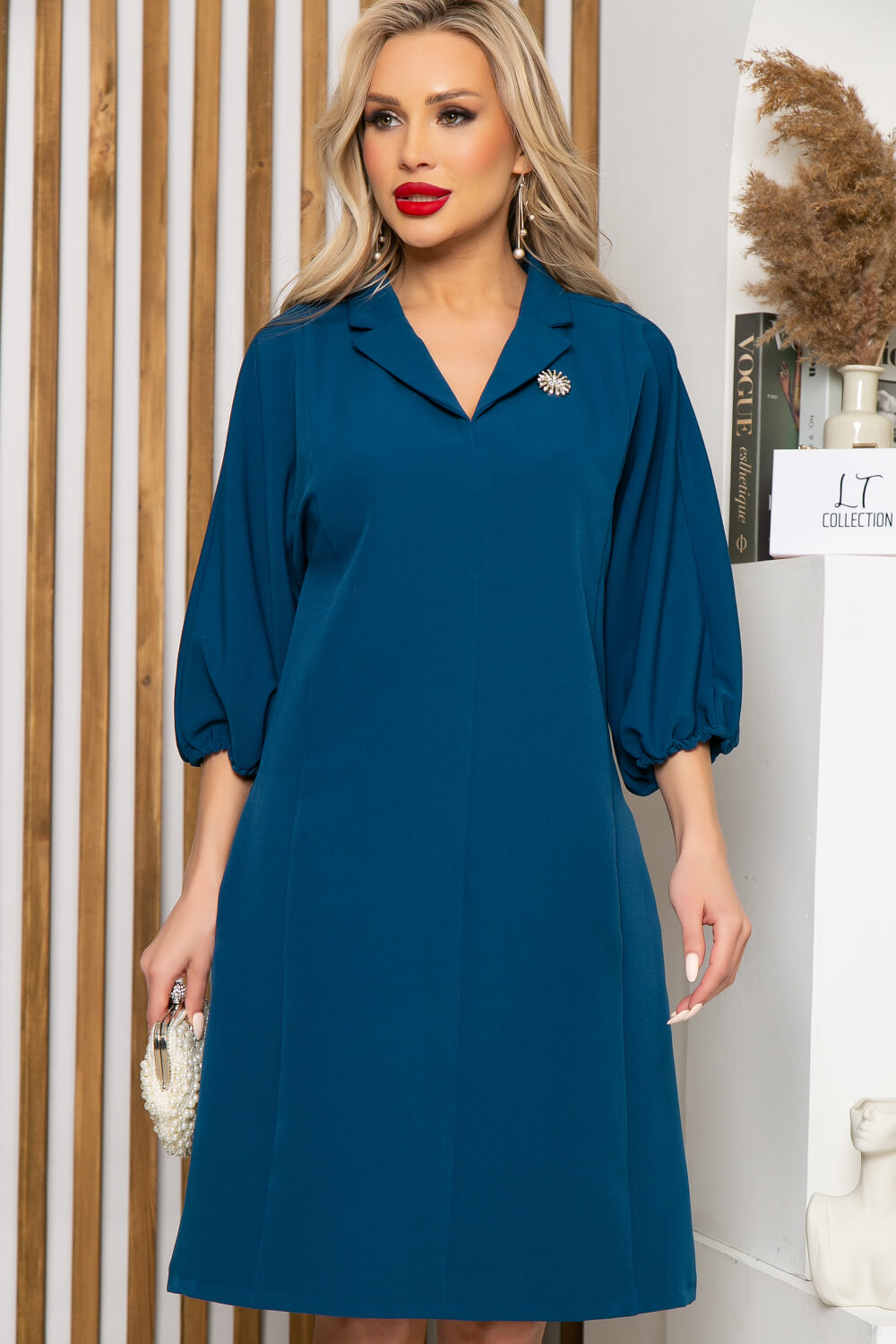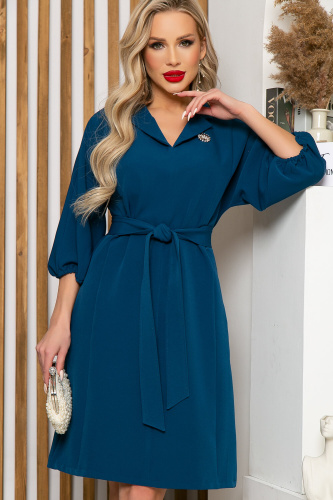 Платье, которое прекрасно подойдёт для создания элегантного делового образа. Платье имеет пышный, укороченный рукав на резинке по низу. Платье средней длины приталенного силуэта, перед - разрезной. В комплект входит пояс из основной ткани и брошь.