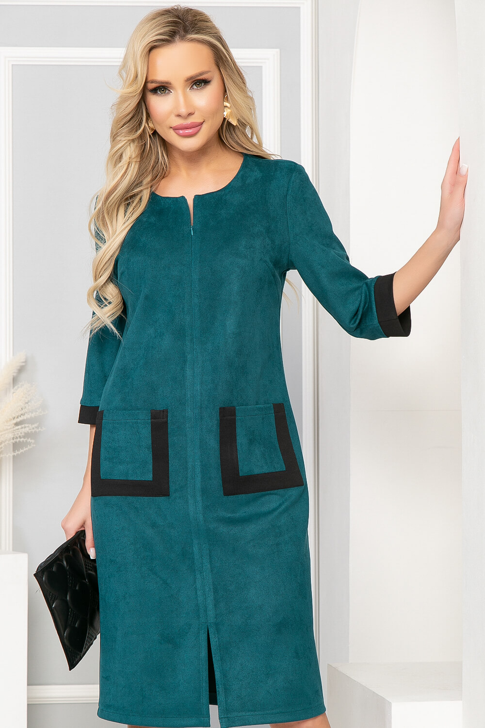 Платье прямого силуэта из спандекса украсит ваш повседневный образ. Спереди по горловине есть небольшой разрез, застёгивающийся на потайную молнию. Втачной рукав, три четверти, отороченный чёрной тканью. По переду платья есть два накладных кармана. По переду есть разрез. Платье без подкладки.