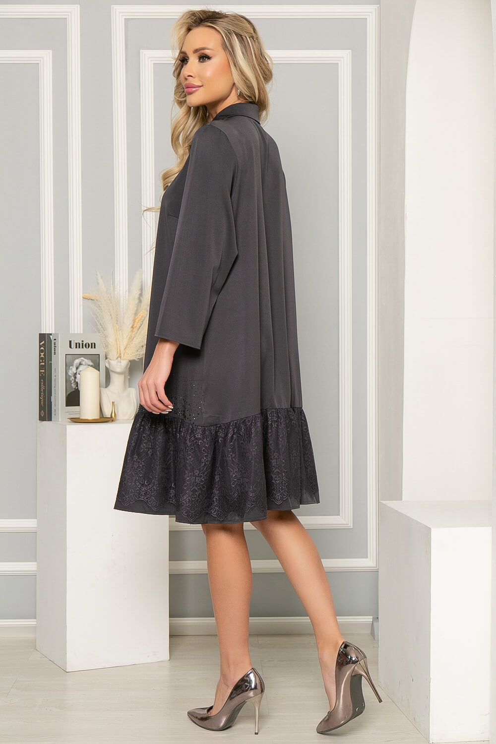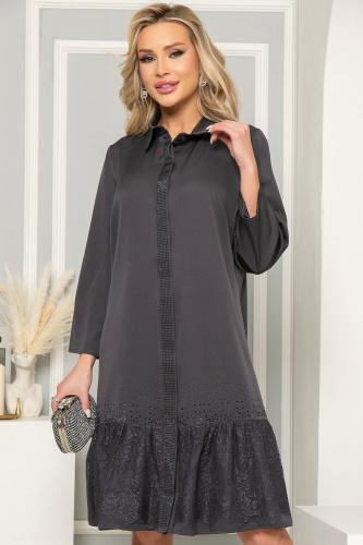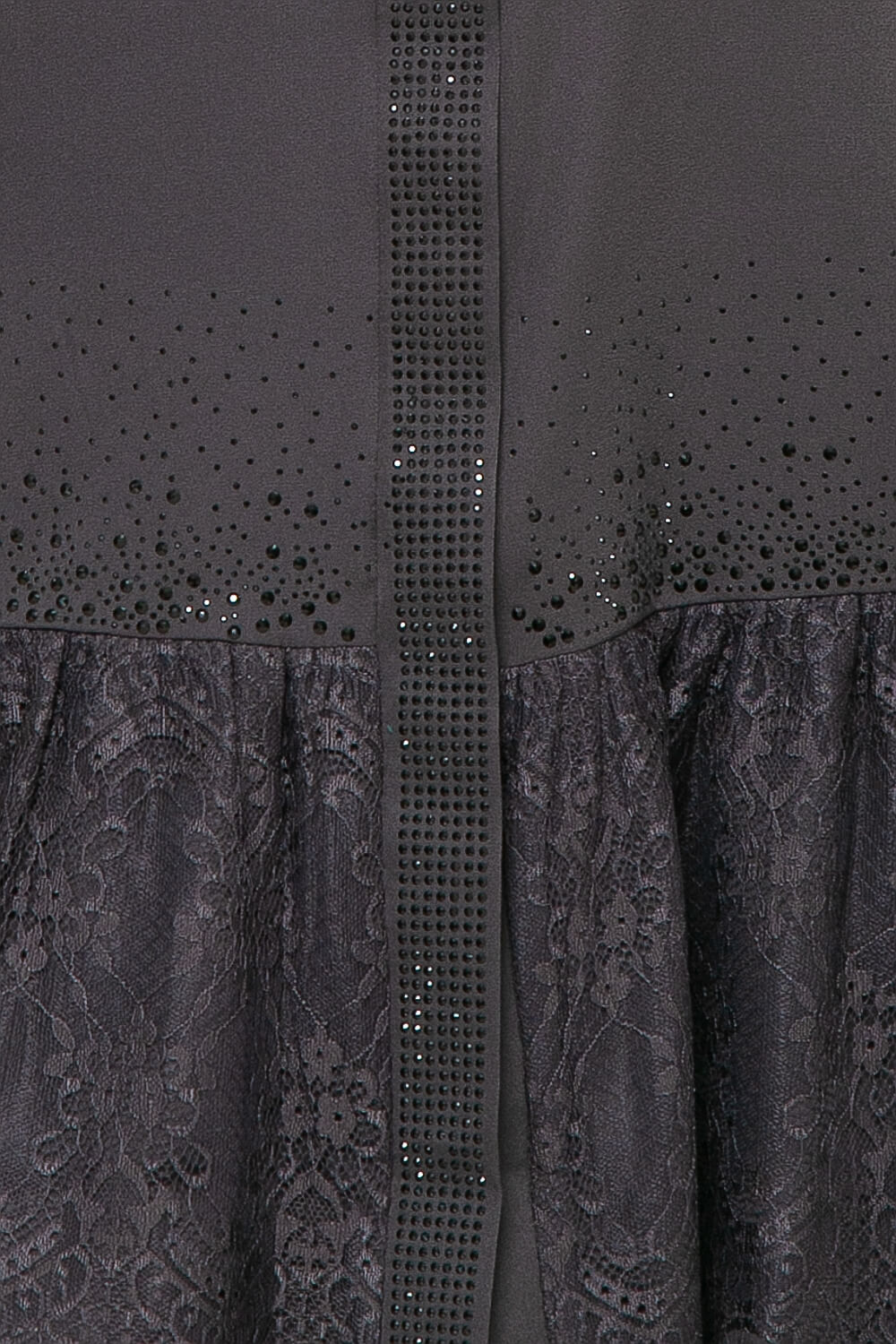 Платье в стиле ваших желаний: искрящееся, женственное, комфортное и практичное. Вечернее платье А-силуэта с широким воланом, украшенным гипюром в тон. По переду - супатная застёжка, украшенная термостразами. Рукав втачной, три четверти. Платье без подкладки.