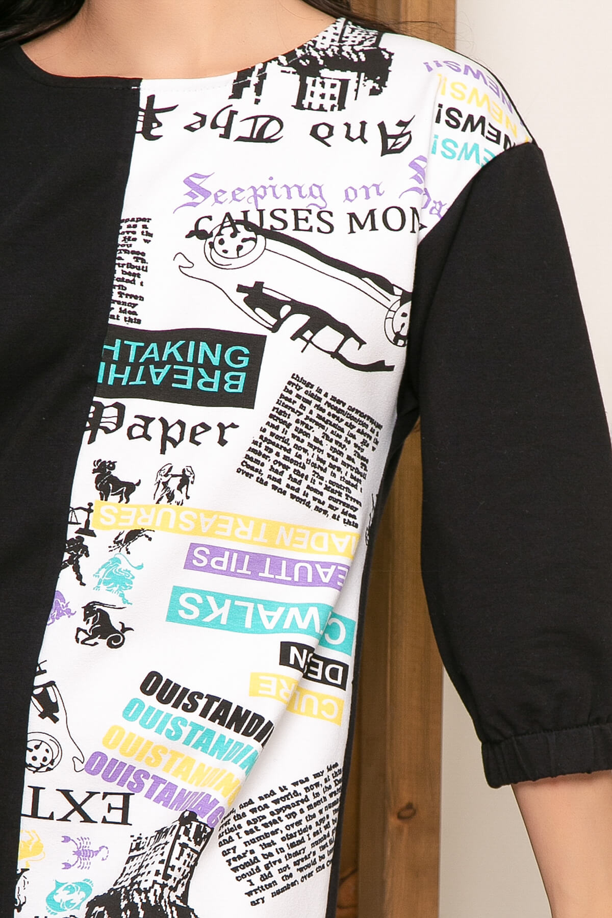 Платье свободного кроя из футера для ценителей стиля "Street style". Создать комфортный и модный образ теперь не составит труда! Платье с лёгкостью впишется в ваш повседневный гардероб, ведь его можно сочетать хоть с кроссовками, хоть с ботинками или другой подходящей обувью. Перед платья выполнен из двух видов ткани: однотонной и принтованной. Спинка - однотонная. Горловина - лодочка, плечо спущенное, рукав 3 четверти, на резине. Низ платья обработан манжетом.