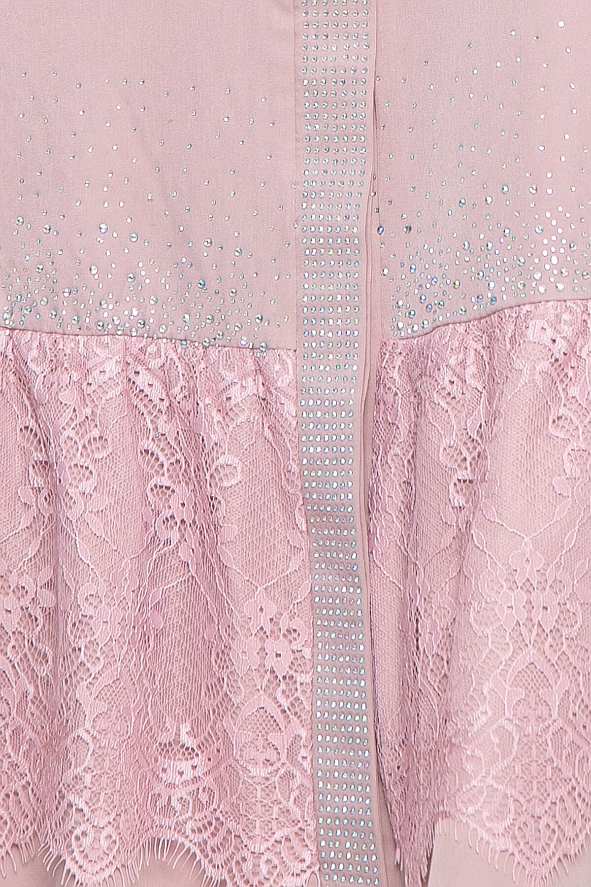 Платье в стиле ваших желаний: искрящееся, женственное, комфортное и практичное. Вечернее платье А-силуэта с широким воланом, украшенным гипюром в тон. По переду - супатная застёжка, украшенная термостразами. Рукав втачной, три четверти. Платье без подкладки.