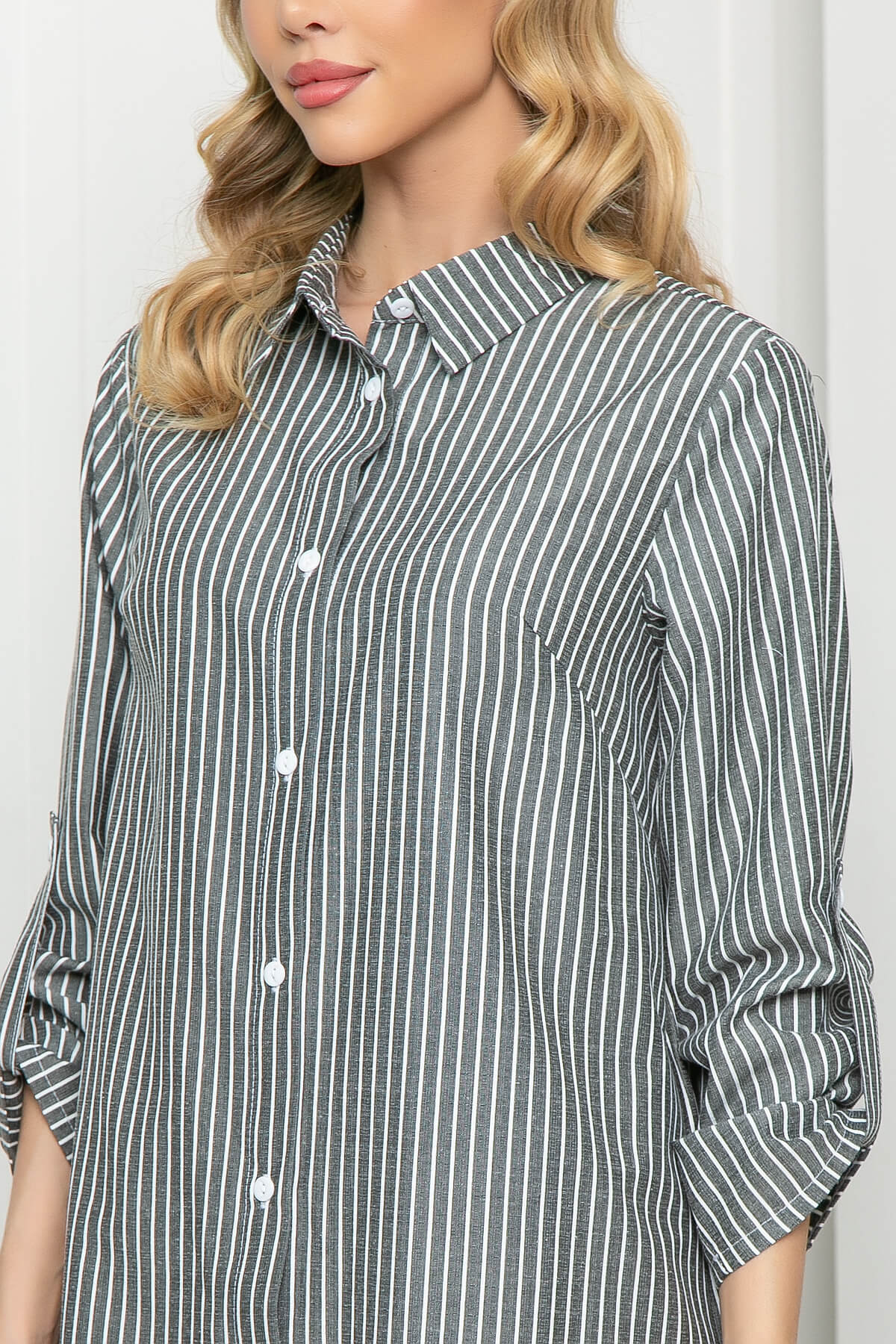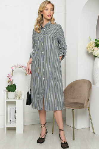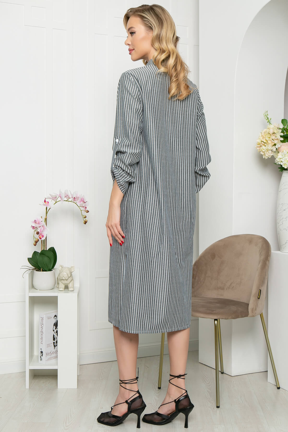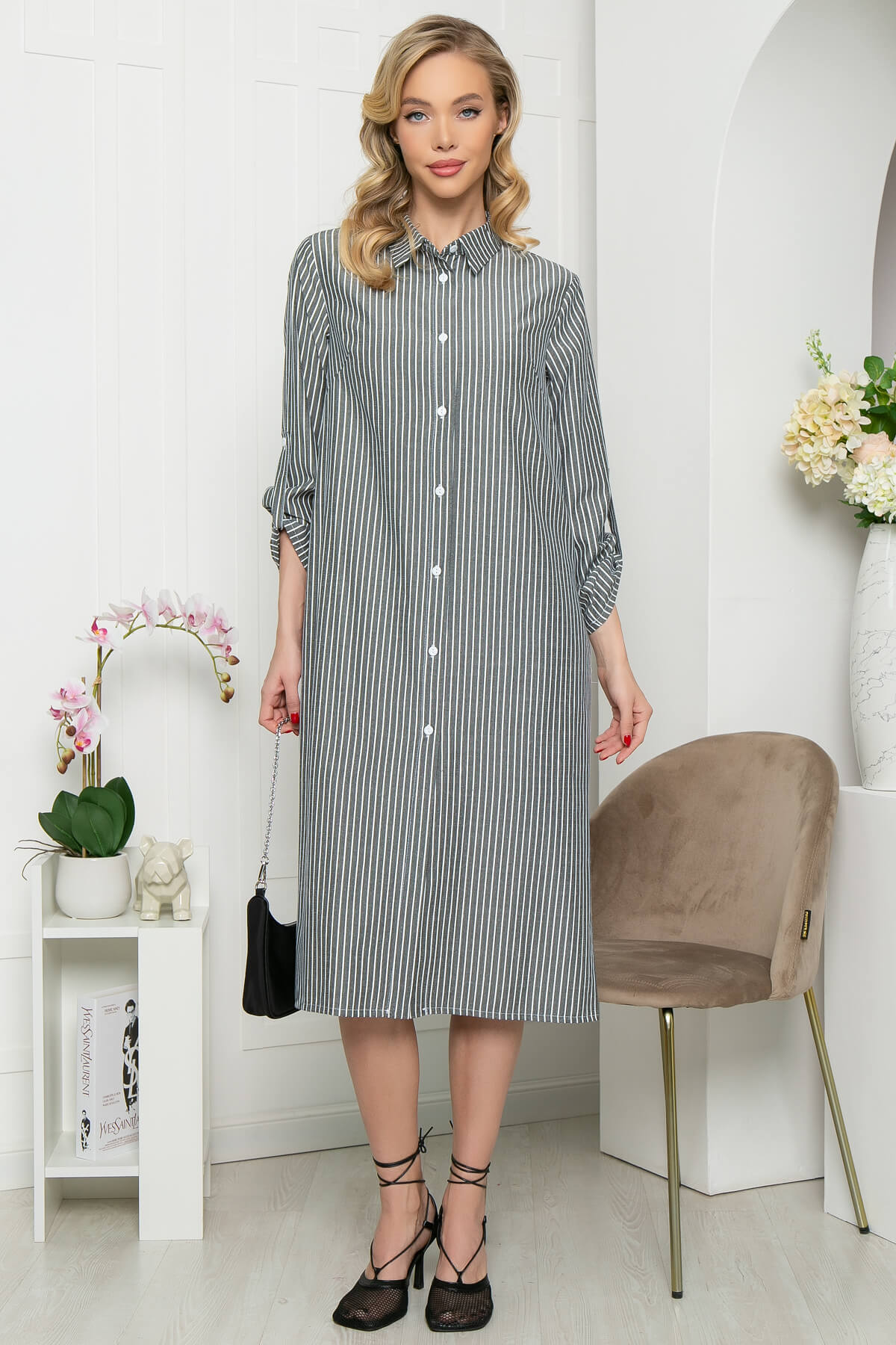Стильное платье-рубашка светлых летних оттенков неприхотливо в уходе и выборе аксессуаров, но при этом является самодостаточным элементом образа. Платье классического рубашечного покроя. Отложной воротник, рукав втачной, семь восьмых, подворачивается на пату. Платье застегивается на пуговицы по переду. По бокам юбки разрезы.