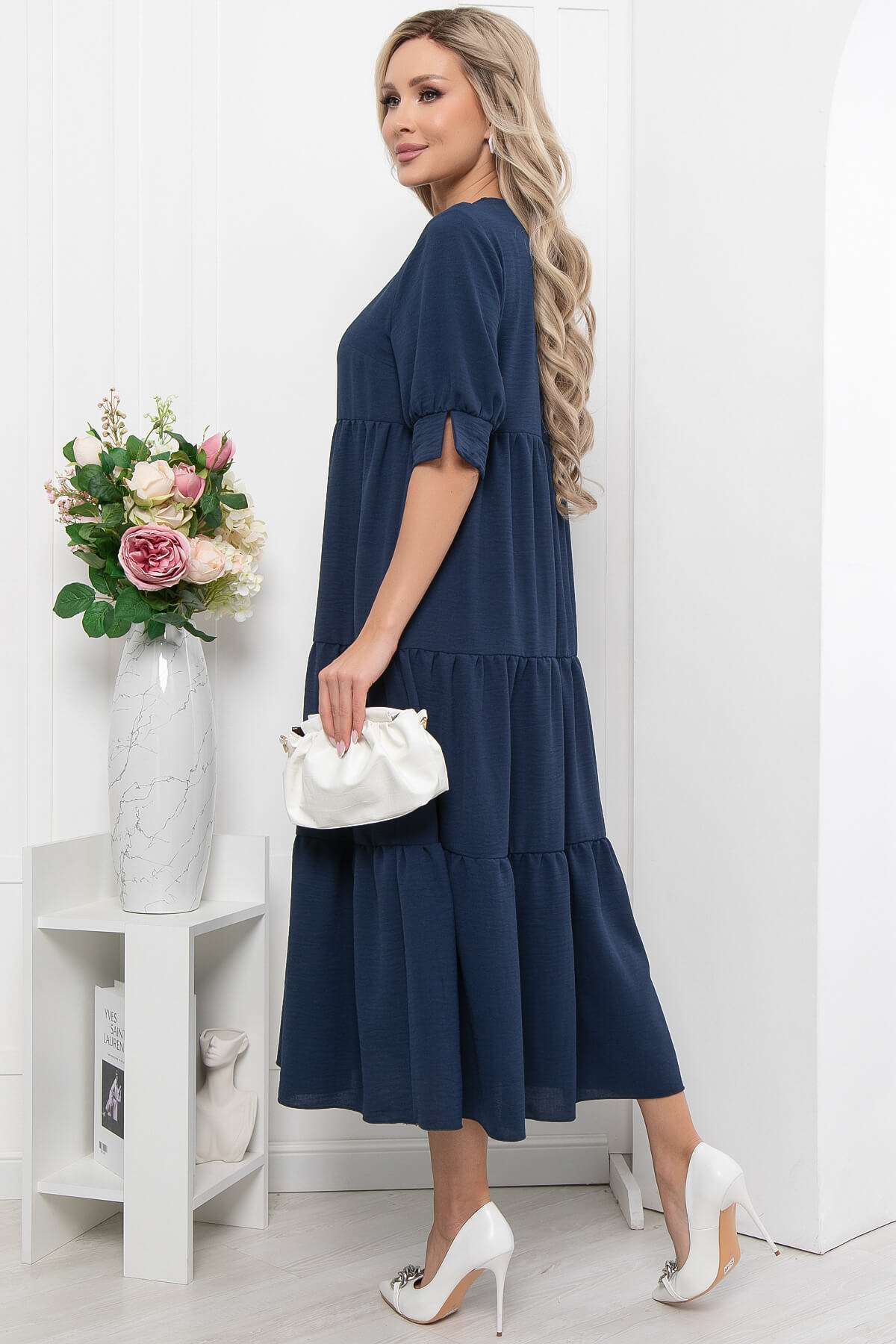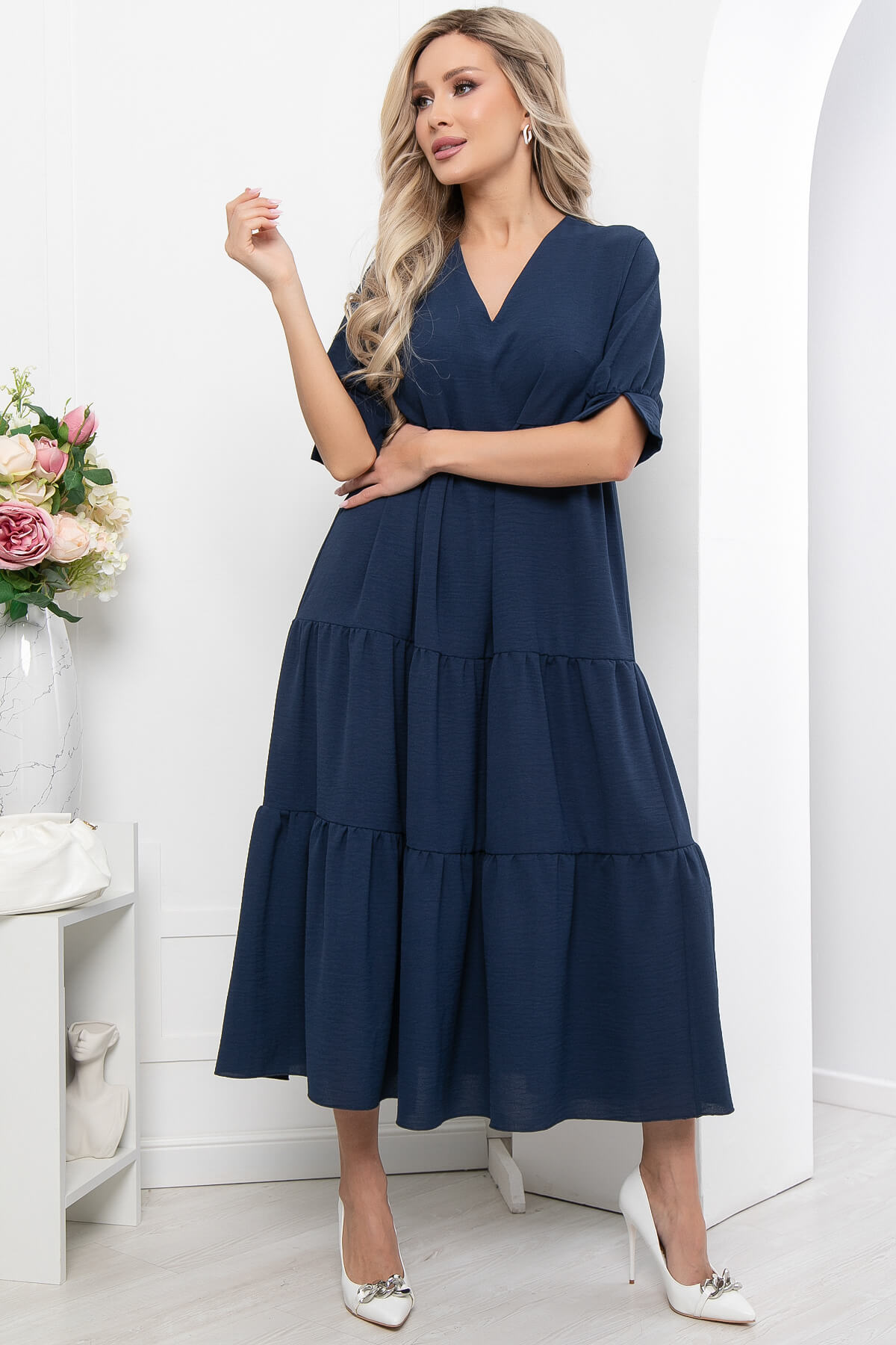Летнее платье из легкой ткани сделает ваш образ воздушным и очень романтичным. Изделие отлично смотрится с любыми видами украшений. Рукав укороченный, украшен манжетой с акцентным разрезом. Изделие украшено тремя воланами.