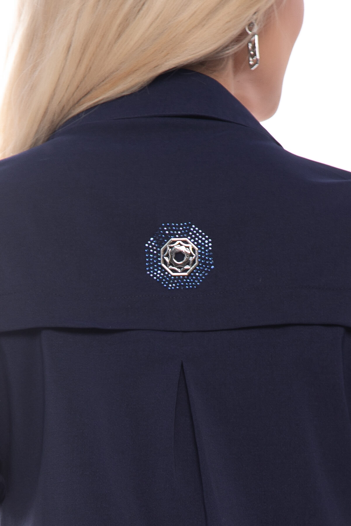 Универсальное платье, которое подходит для работы в офисе или для прогулок. Отложной вором подчеркивает деловой стиль, а украшение по переду придает образу кокетства. Рукав укороченный, втачной, застегивается на пату. Изделие по спинке удлинено.