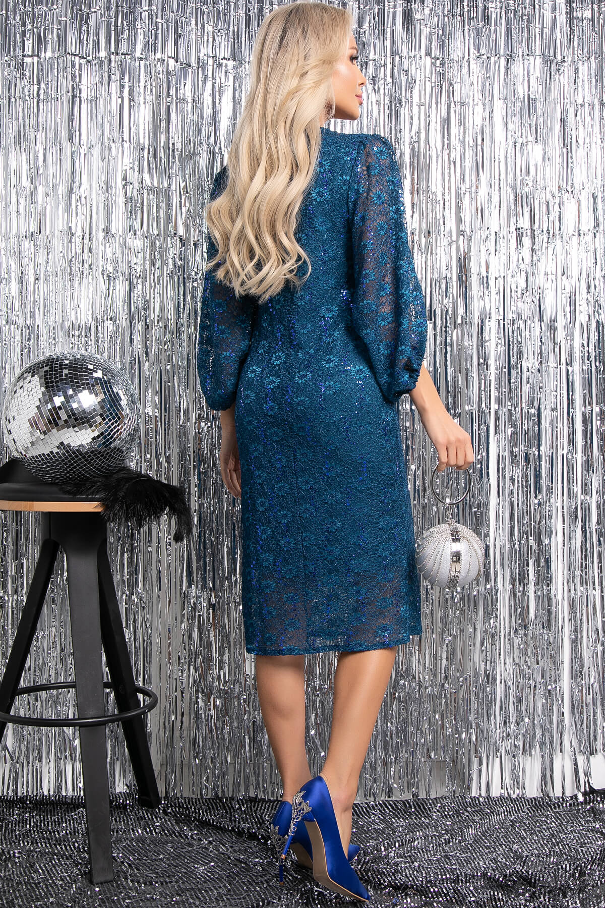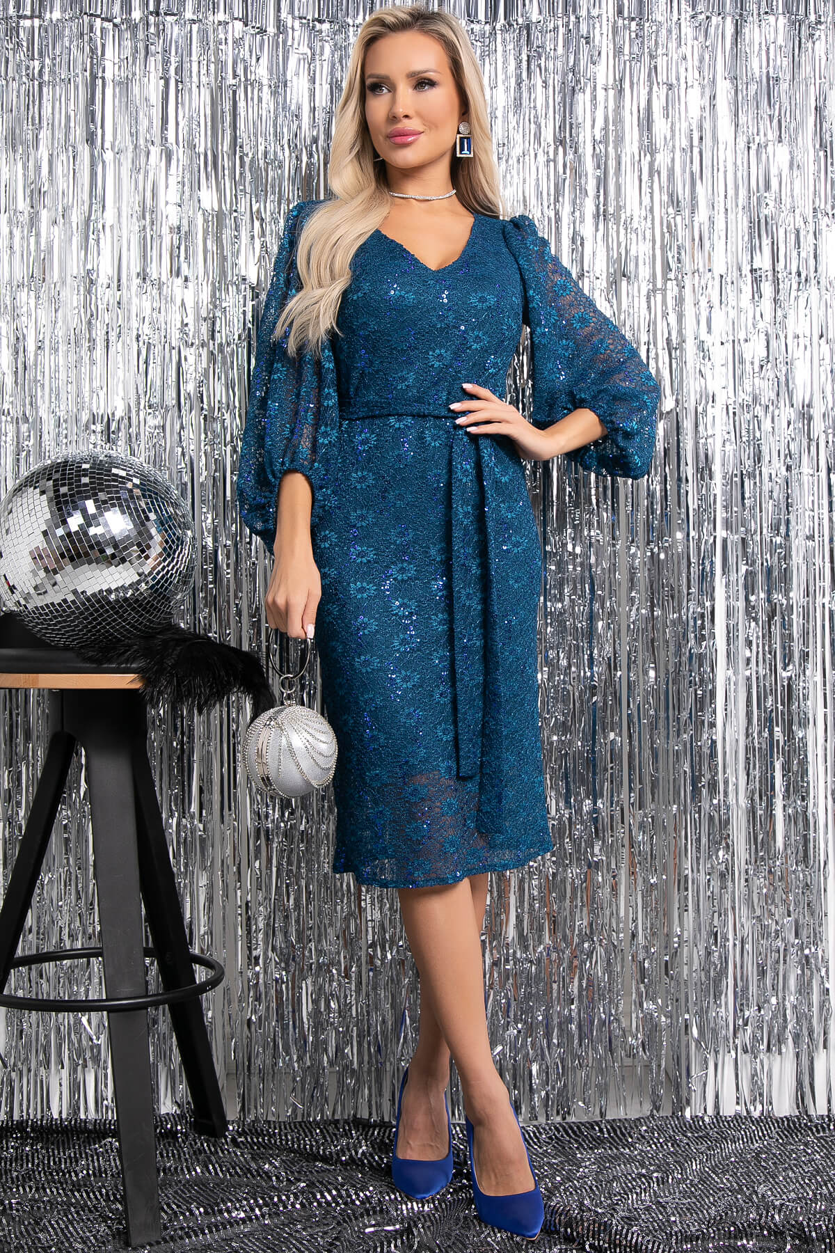 Роскошное платье в элегантном синем оттенке сделает Вас звездой на любом мероприятии. Красивый V-образный вырез, втачной широкий рукав, собранный по низу на резинку. Разрез по ножке добавит эффектность Вашему вечернему образу. Платье на подкладке. В комплект входит пояс из основной ткани, который идеально подчеркивает линию талии.