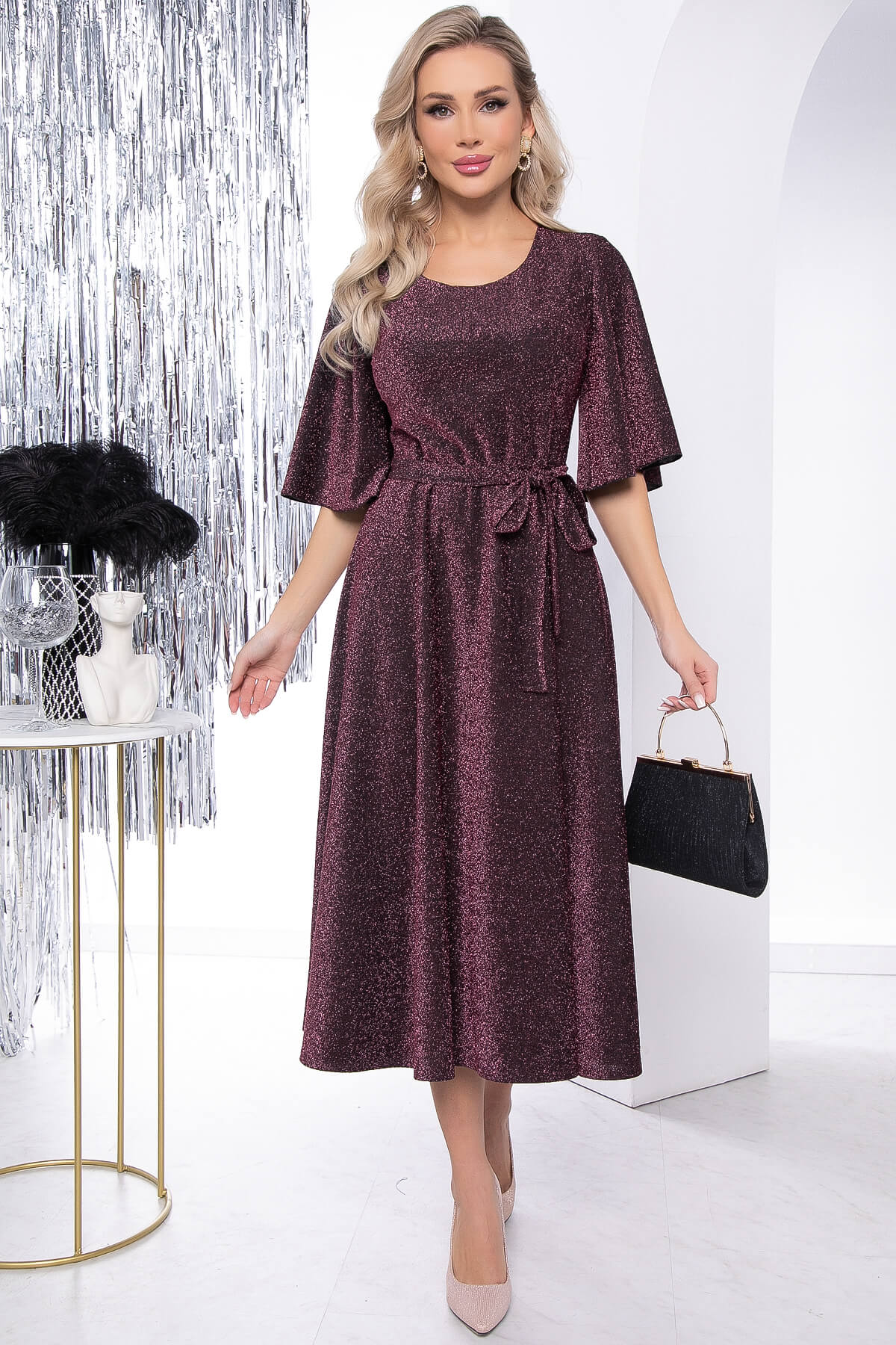 Вечернее платье из мерцающей ткани создаст невероятную атмосферу праздника. В таком платье вы точно будете в центре внимания. Оно достаточно сдержано, но в то же время наполнено акцентными деталями, что идеально подчеркивает вашу красоту. Изделие имеет втачной, укороченный, расклешенный рукав. По талии на резинке. В комплект входит пояс из основной ткани.