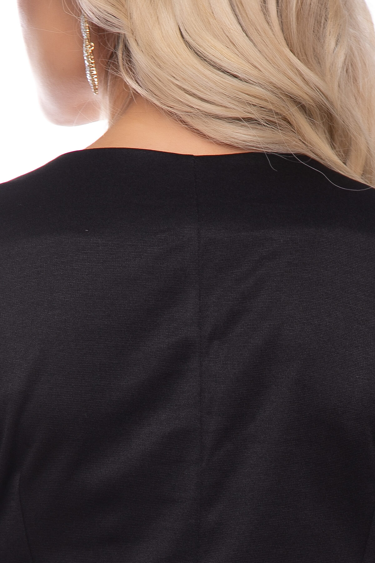 Вечернее платье прилегающего силуэта в чёрном классическом оттенке. Эффектное платье с V-образным вырезом. Перед скроен по принципу платья с запахом со сборкой в области талии. По низу изделие скруглено, что визуально удлиняет ножки. Шикарный вырез идеально подчеркивает зону декольте. Платье без подкладки.