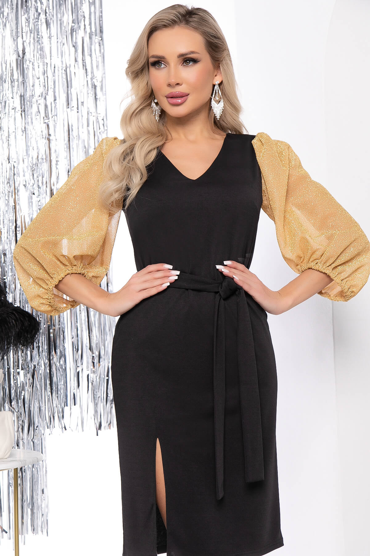 Специально для ценителей классики платье "Магия красоты" в новом исполнении. Основа платья выполнена из трикотажной ткани классического чёрного цвета. Украшением данной модели являются широкие мерцающие рукава. Красивый V-образный вырез горловины. Разрез по ножке добавит эффектность в Ваш вечерний образ. Пояс из основной ткани входит в комплект.
