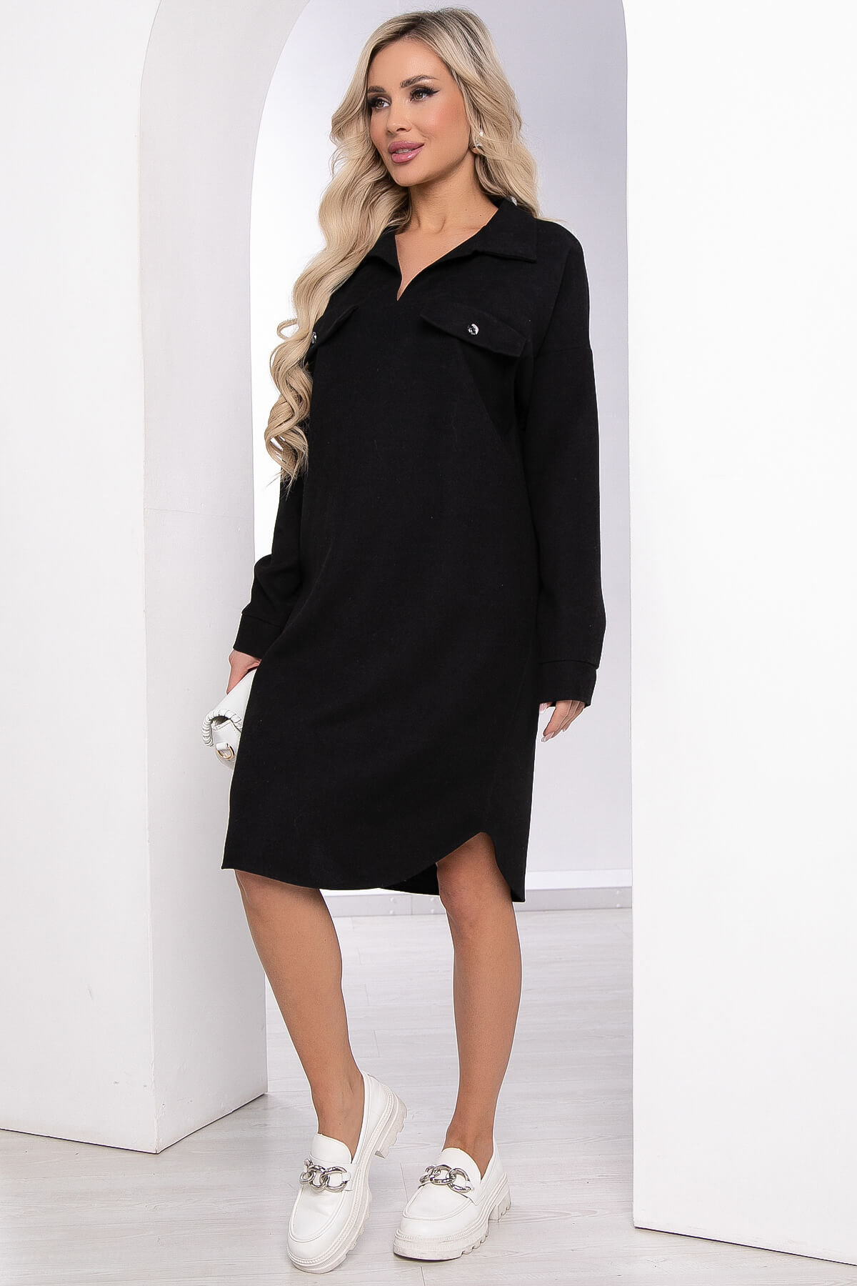 Стильное и комфортное платье - рубашка в классическом черном цвете на каждый день. Модель можно носить с поясом из основной ткани, подчеркивая талию. Отложной воротничок, рукав длинный со спущенным плечевым швом, на манжете. На груди имитация карманов. В таком свободном платье можно ходить как в офис, так и на деловые встречи. Для элегантности к такой модели платья можно добавить контрастный шарф.
