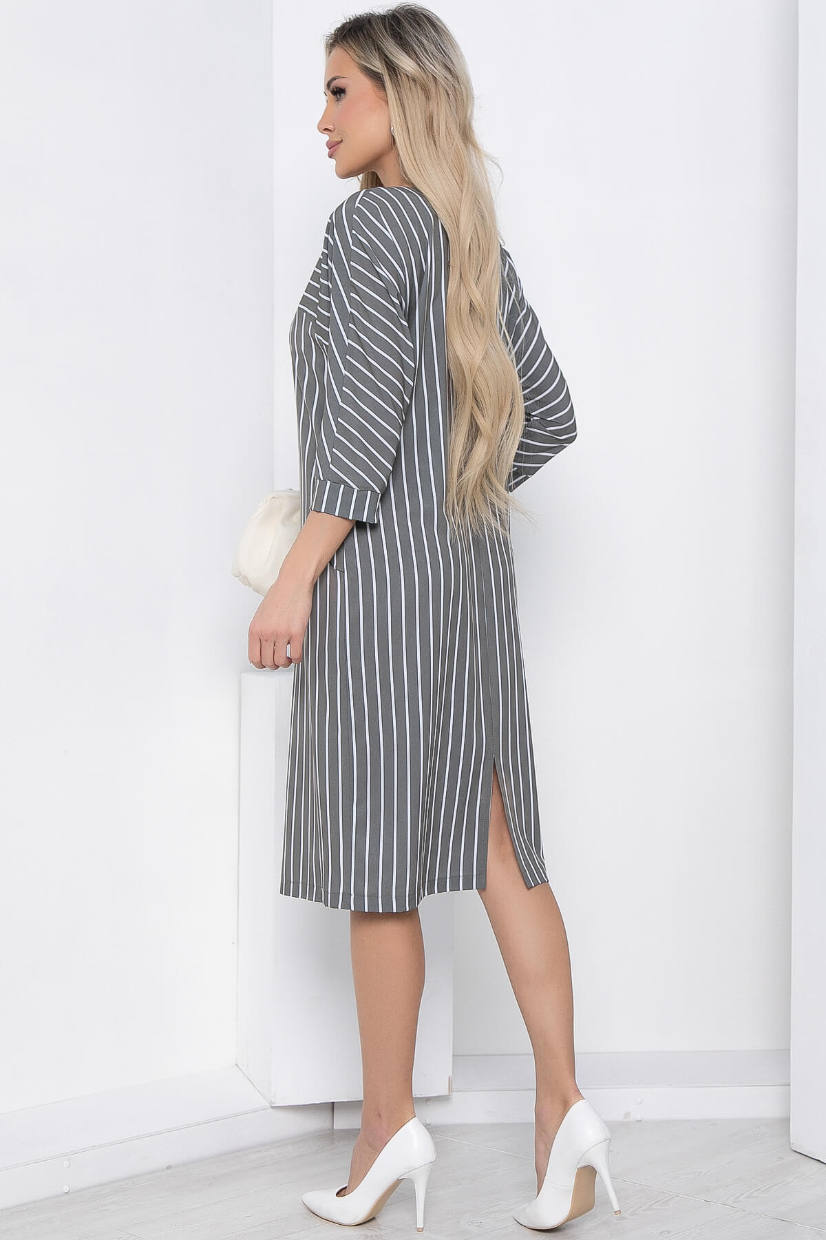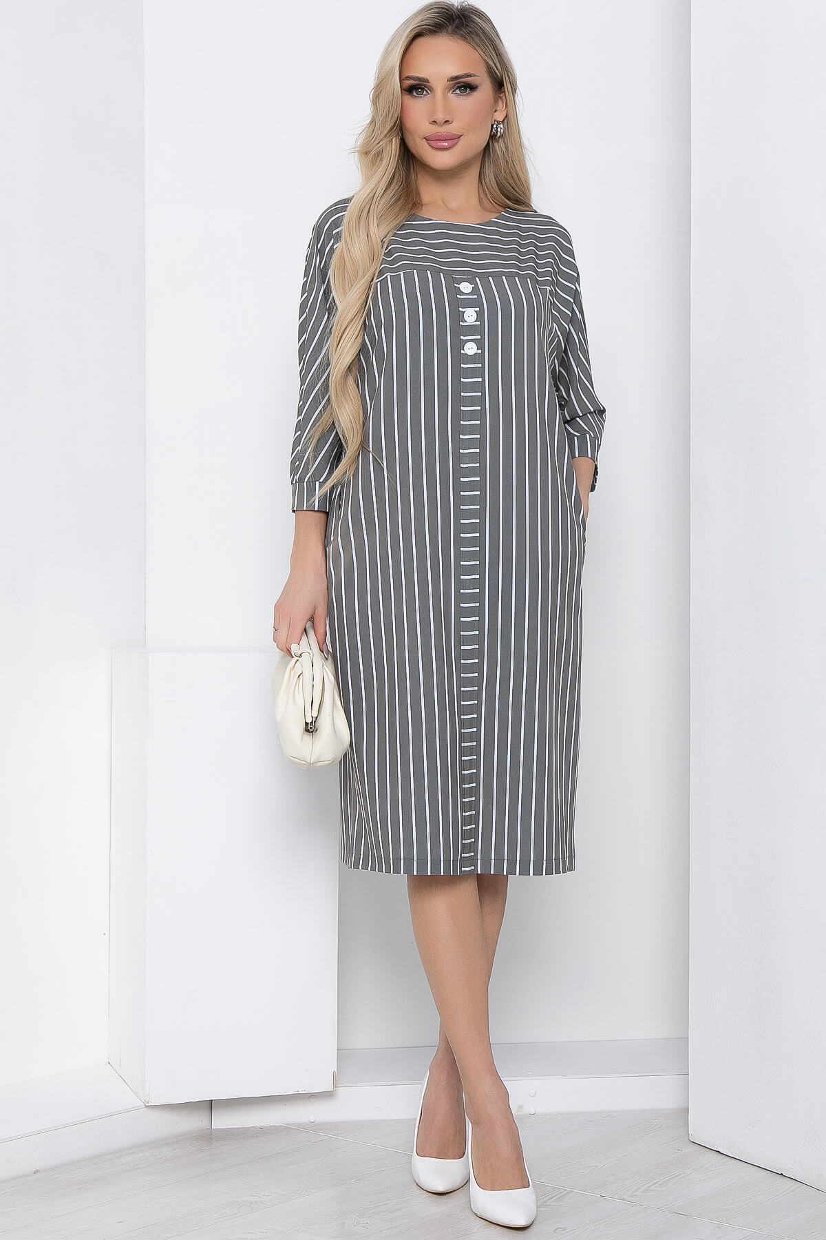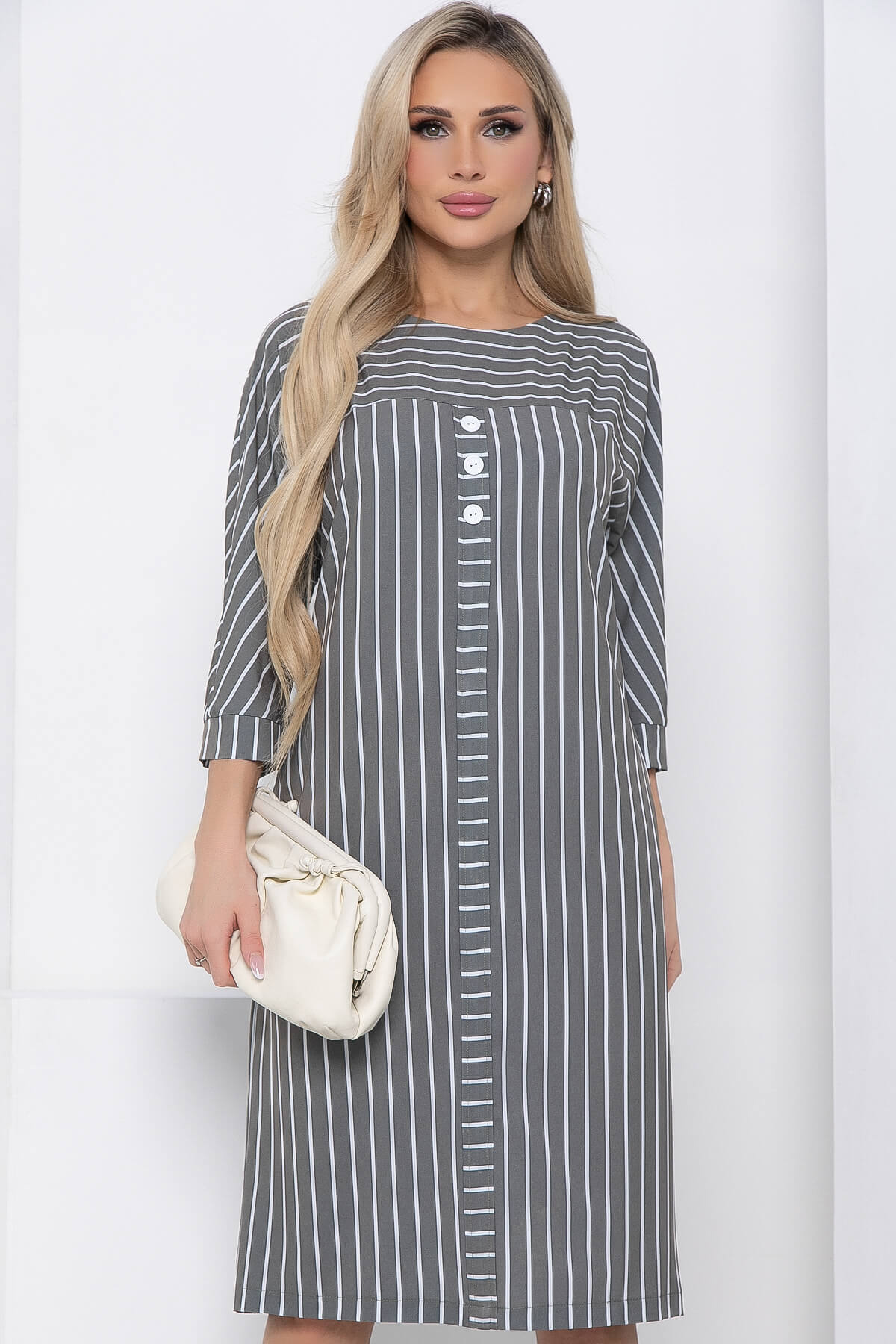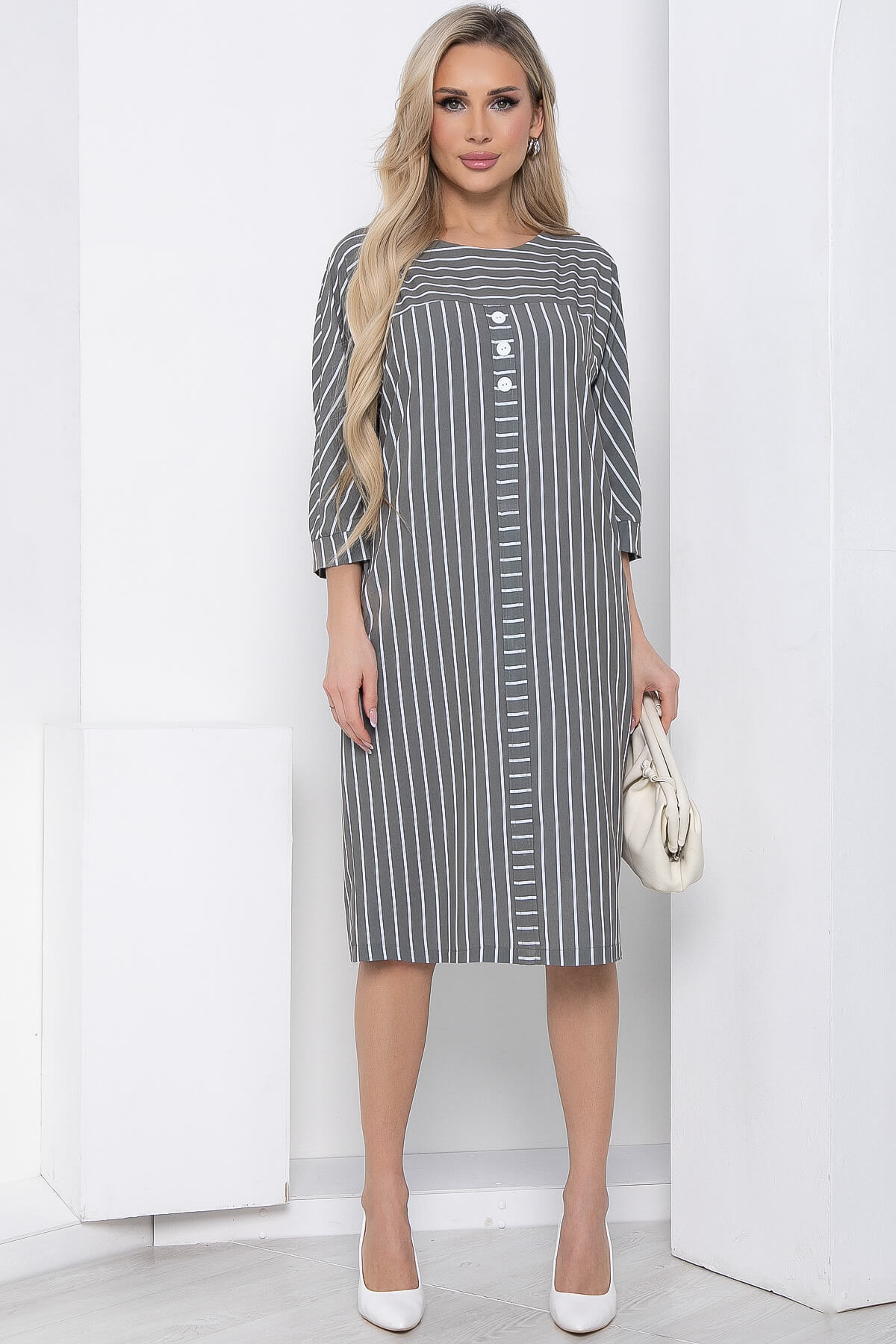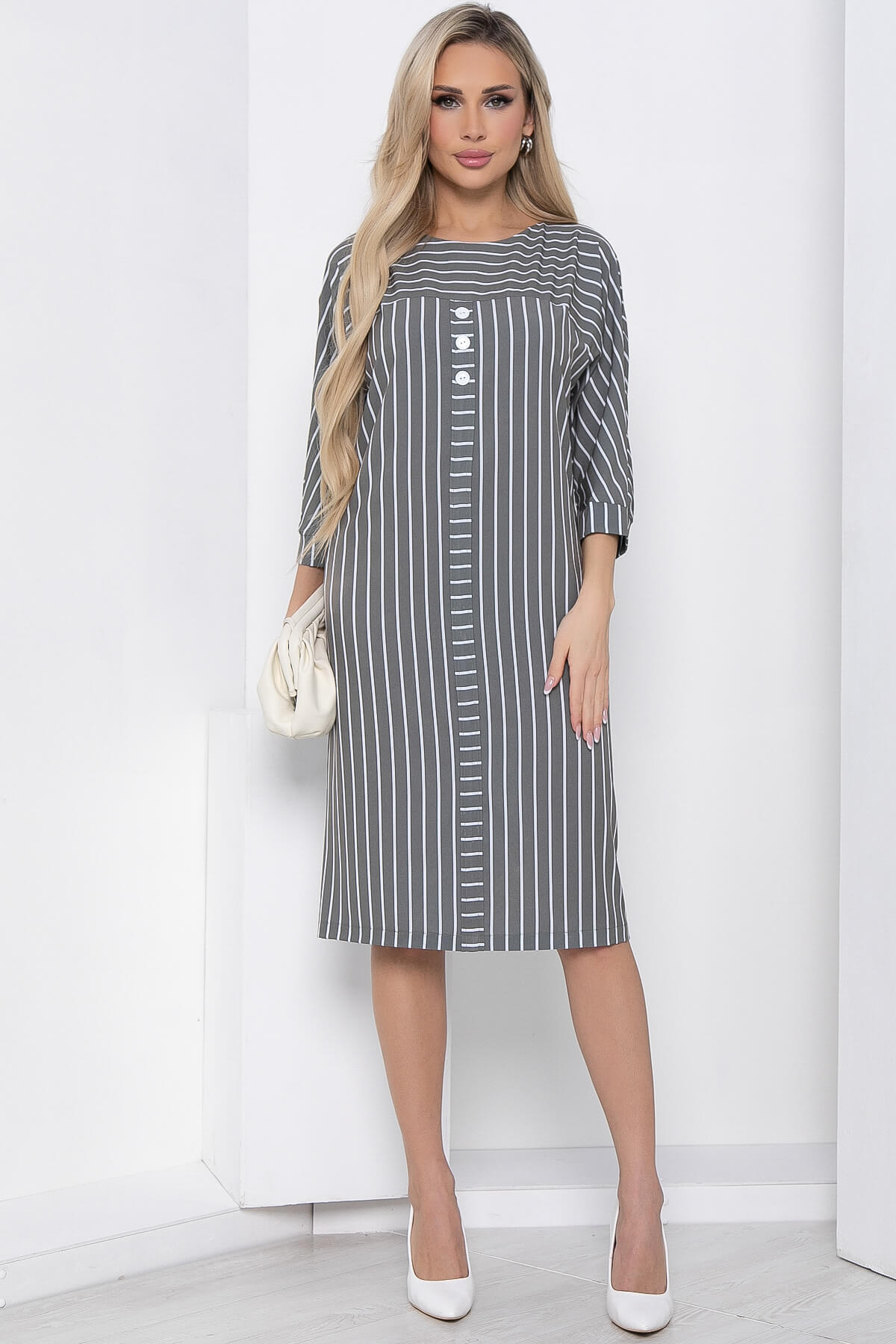 Оригинальное и стильное платье свободного силуэта в полоску для создания повседневного образа. Комфортная модель скроена для любого типа фигуры и отлично подойдет для офисного или повседневного образа. Рукав по типу "летучая мышь", 3/4. По передней части изделия кокетка и планка с декорированными пуговицами.