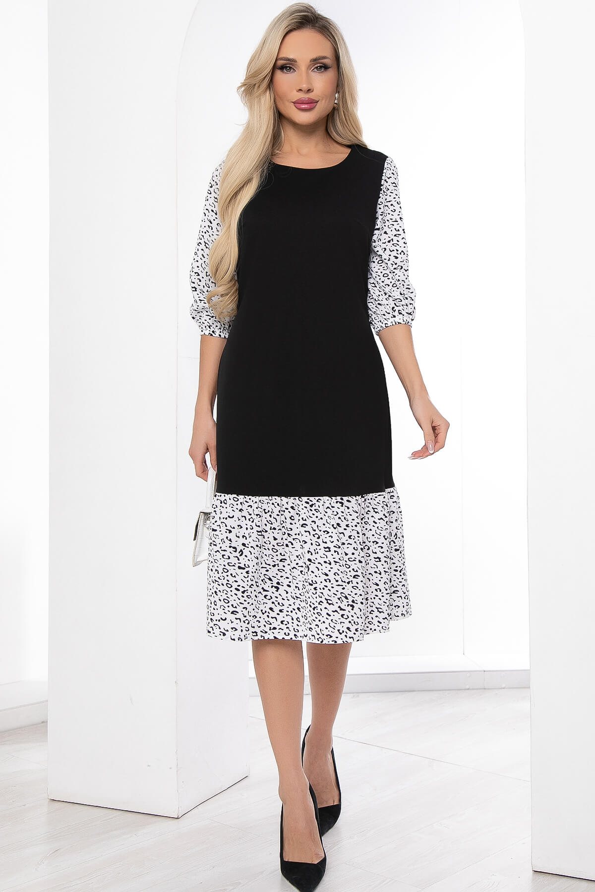 Стильное платье в классическом чёрном оттенке с акцентными деталями с анималистическим принтом. Платье полуприлегающего кроя является самой удобной моделью, скрывает недостатки фигуры и не ограничивает в движениях. Рукав втачной, укороченный, по низу на резинке. В комплект входит пояс из акцентной ткани.