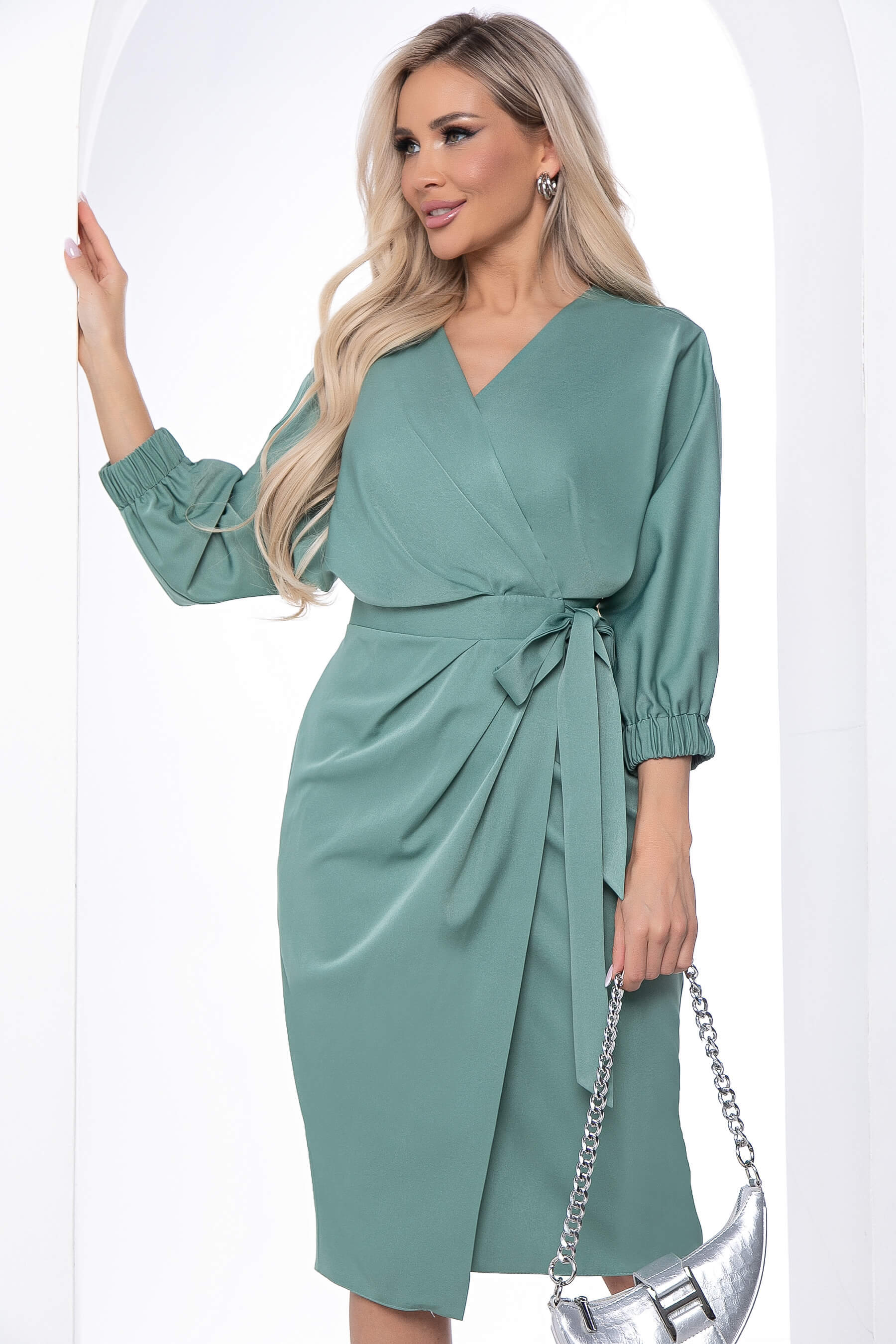 Оригинальный силуэт платья с запахом, придает облику невероятную женственность и романтичность.V-образная горловина, созданная за счёт запаха, эффектно подчёркивает шею и слегка удлиняет её, а перечёркнутая по диагонали фигура визуально делается стройнее и выше, плечи сужаются, а талия становится отчётливее.