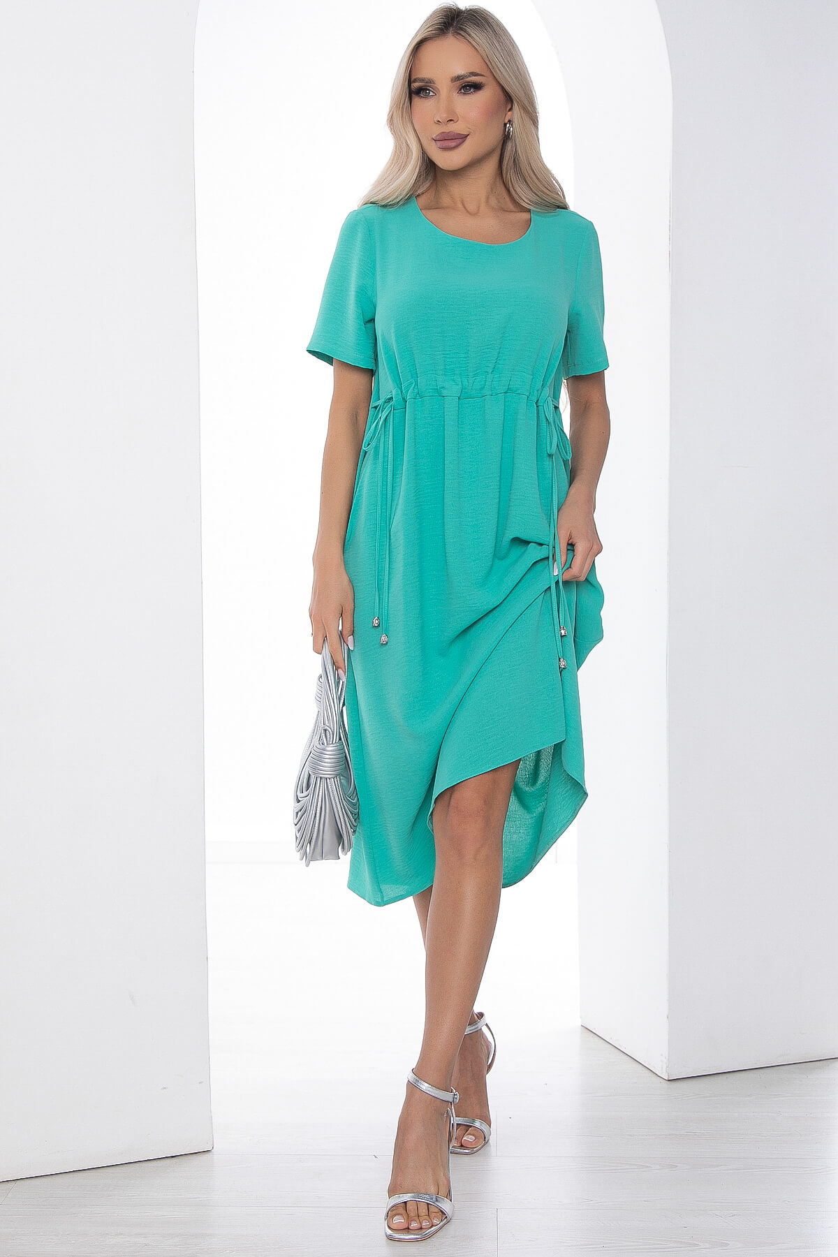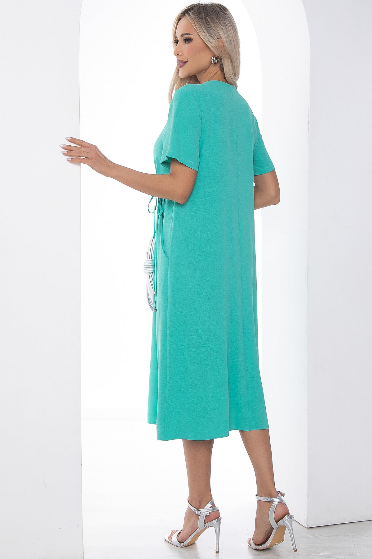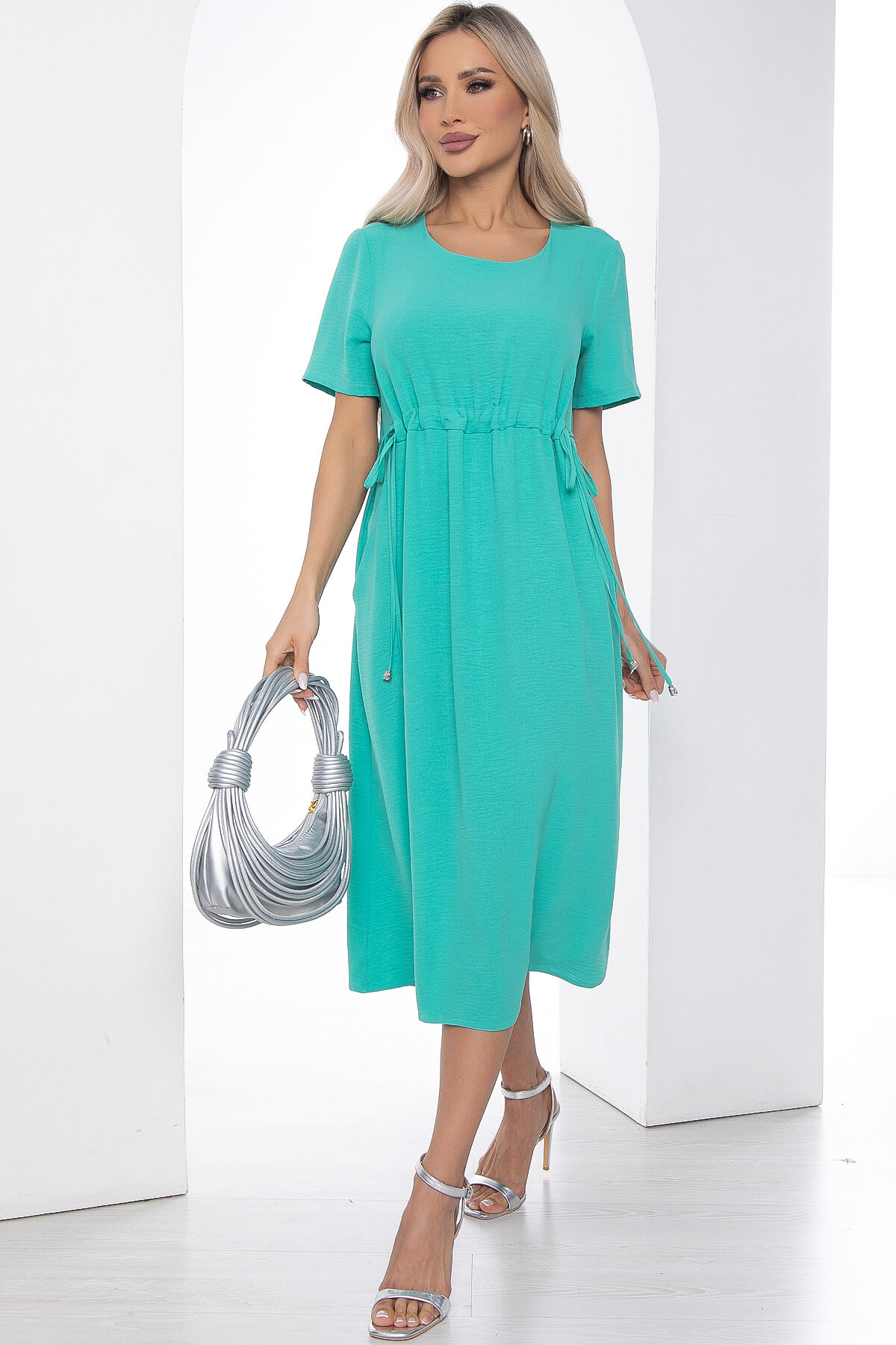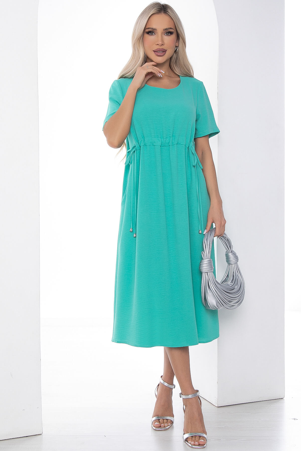 Яркое летнее платье длиной миди — отличный выбор, если вы ищете расслабленный, но в то же время стильный наряд. Платье в бирюзовом оттенке поможет создать изящный и лаконичный дневной летний образ. Изделие с кулиской под грудью, можно завязывать банты. Рукав укороченный, втачной. Спереди есть два потайных кармана.