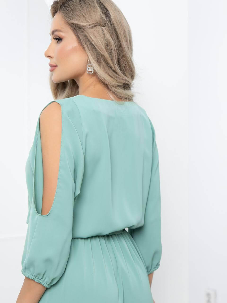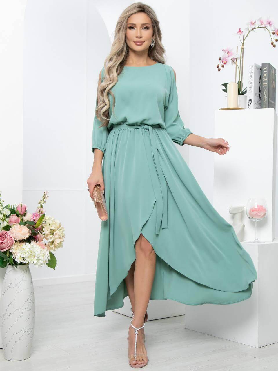 Шикарное макси-платье свободного силуэта с акцентными рукавами. Платье свободного силуэта, талия собрана на резинку и отделяет верх от юбки, скроенной на запах. Рукав втачной, три четверти с овальным вырезом. Горловина - лодочка. В комплекте тканевый пояс.