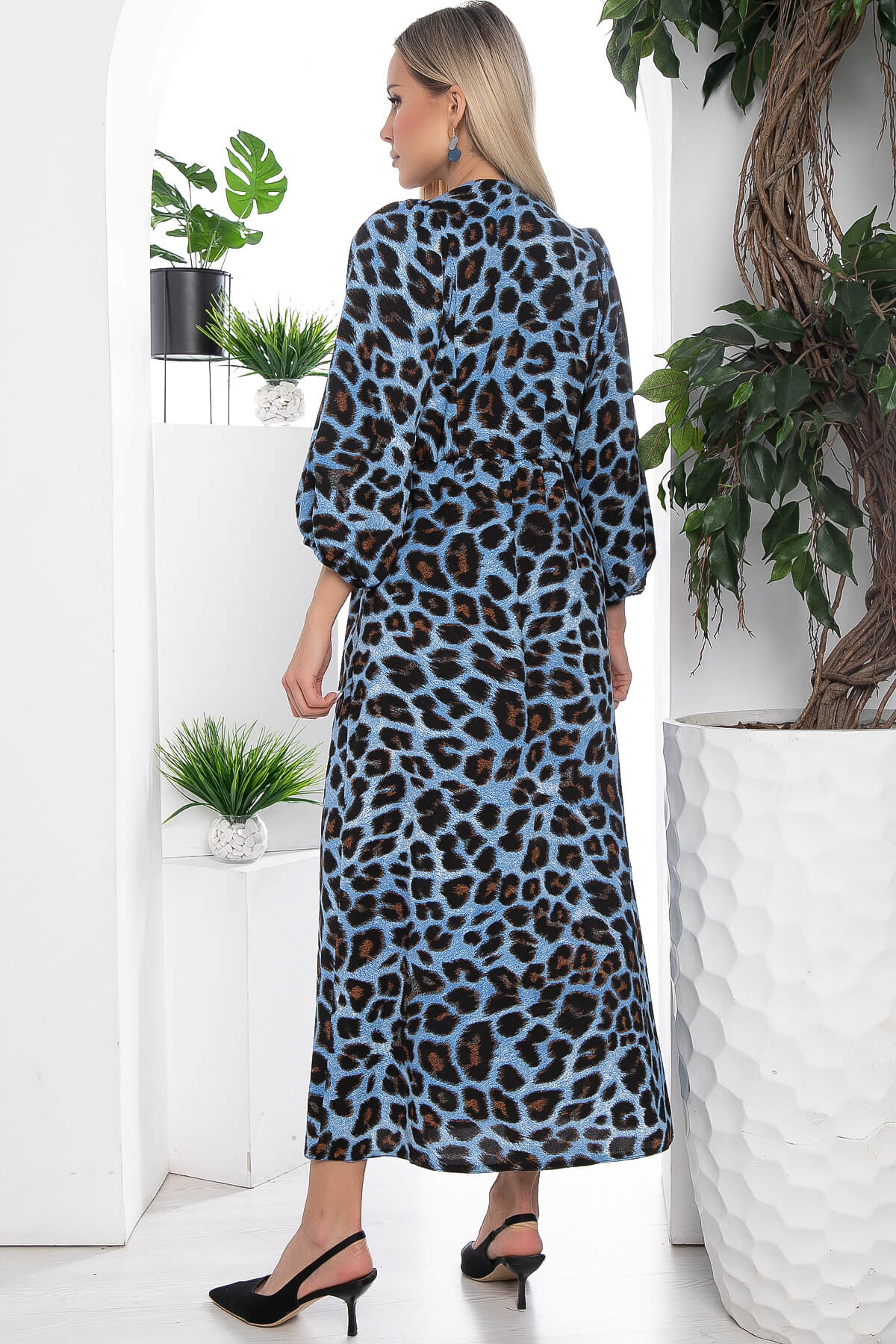 Леопардовый принт — трендовая вещь на пике моды и стиля! Его можно носить на вечерние мероприятия, праздники или на повседневные прогулки по городу. Платье на резинке по талии, рукав 3/4 на резинке, длинный разрез по ноге.