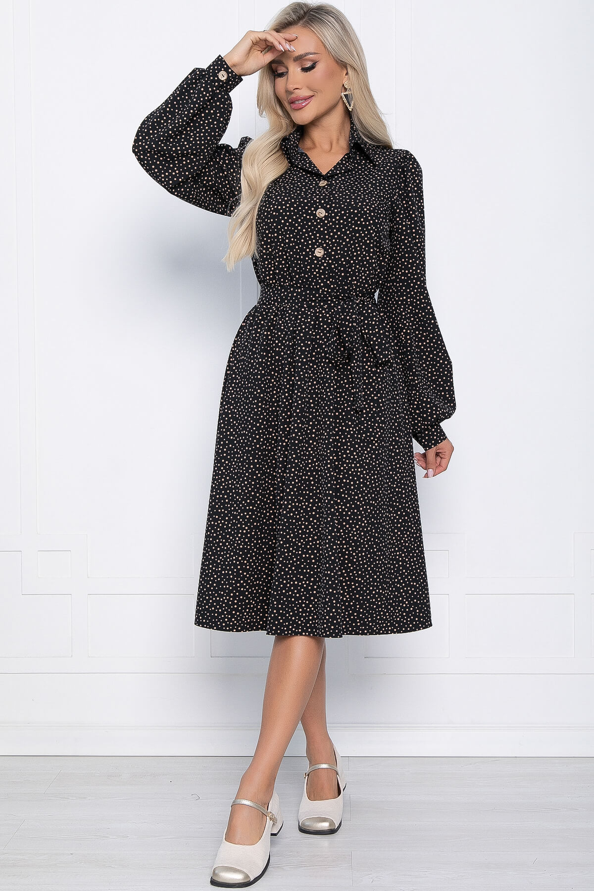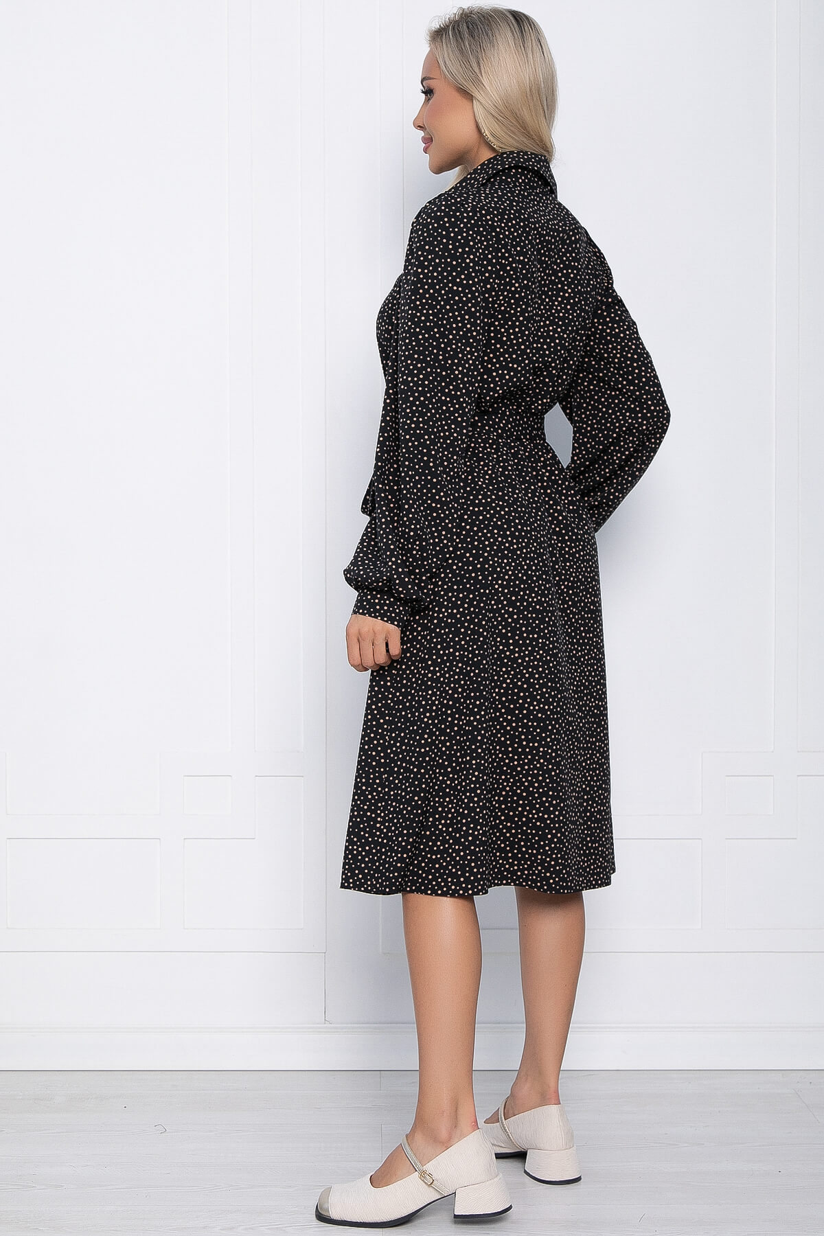 Чёрное платье в горошек длиной миди отлично подойдет для вечернего выхода, так и для повседневного образа. Платье отрезное по талии, и на резинке. По переду застёгивается на пуговицы, пояс из основной ткани входит в комплект.