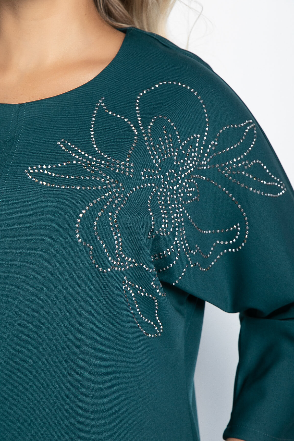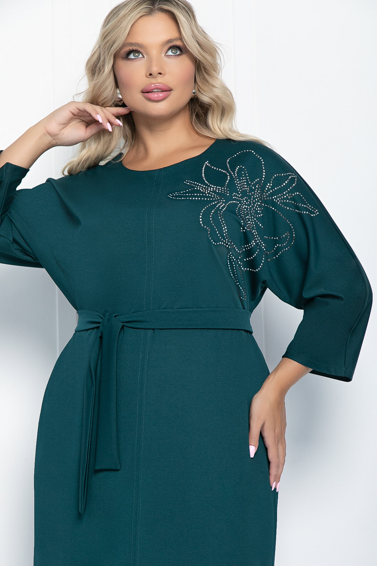 Платье из трикотажа, которое создано, чтобы подчеркнуть вашу женственность и создать легкий и воздушный образ. Элегантность и комфорт в одном флаконе! Изделие полуприлегающего силуэта с игривым разрезом по переду. Рукав широкий, скроенный по типу "летучая мышь". Изделие украшает флористический принт из страз. В комплект входить пояс из основной ткани, который идеально подчеркивает преимущества фигуры.