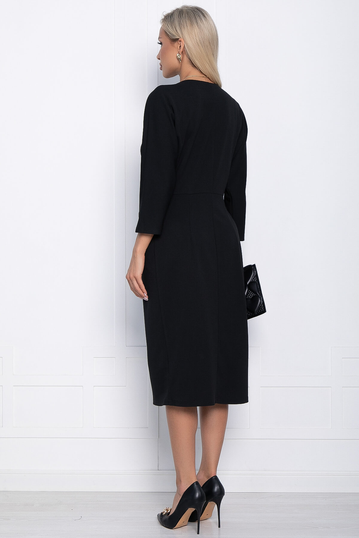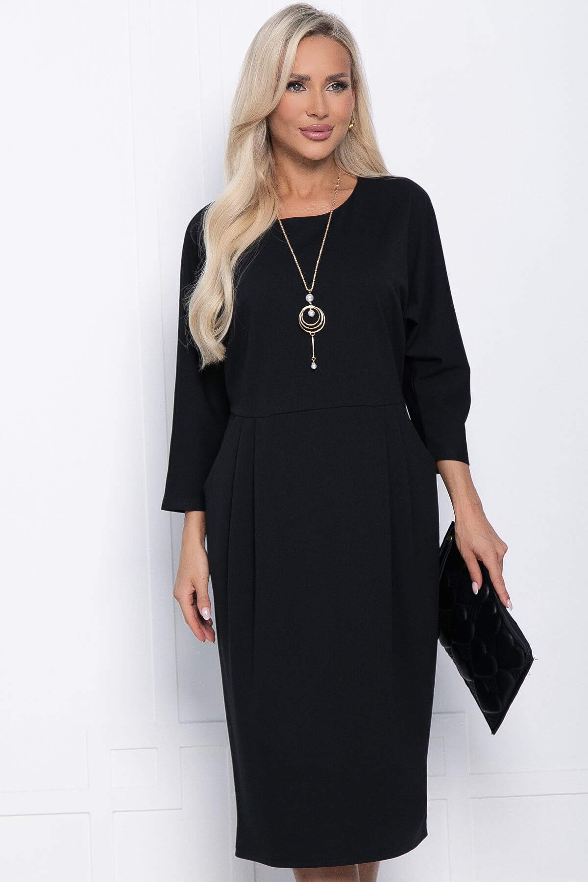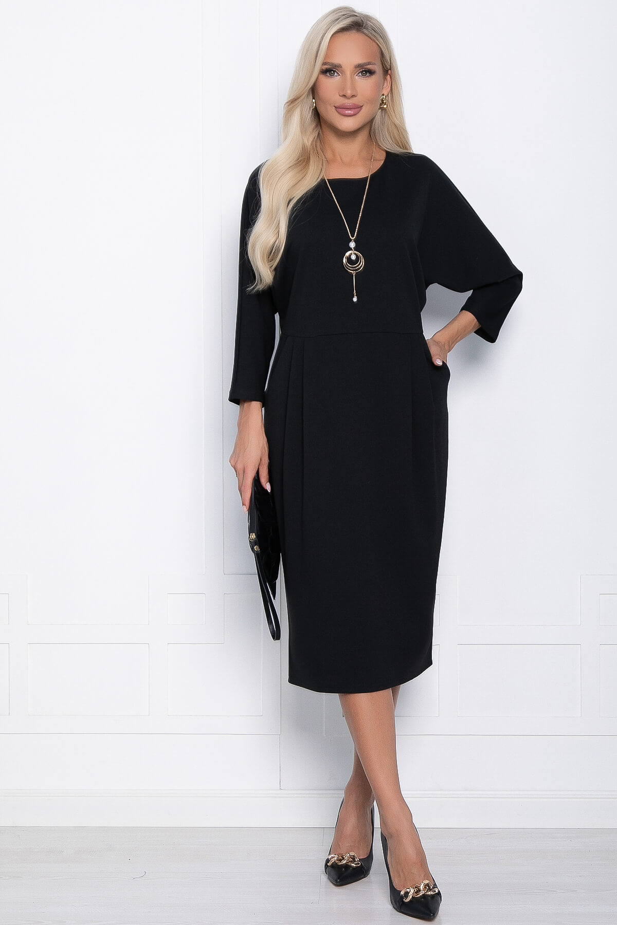 Восхитительное платье длины миди в базовом чёрном оттенке. Идеально подойдет на каждый день, но, добавив в образ яркие аксессуары, вы сможете затмить окружающих своей красотой и элегантностью на любом вечернем мероприятии. Его минималистичный дизайн даёт в этом плане полную свободу действий. Подвеска идёт в комплекте.