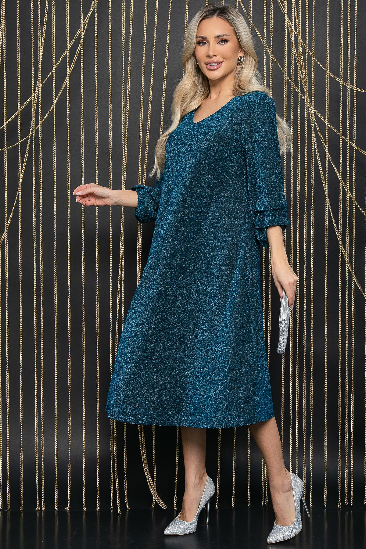 Привлекательное платье А-силуэта с втачным рукавом на резинке. V-образный вырез подчеркивает женственность и изящество. Пояс из той же ткани, что и платье, с пряжкой, украшенной стразами, придаёт изделию изысканный и стильный вид. Это платье идеально подходит для особых случаев или вечерних выходов.