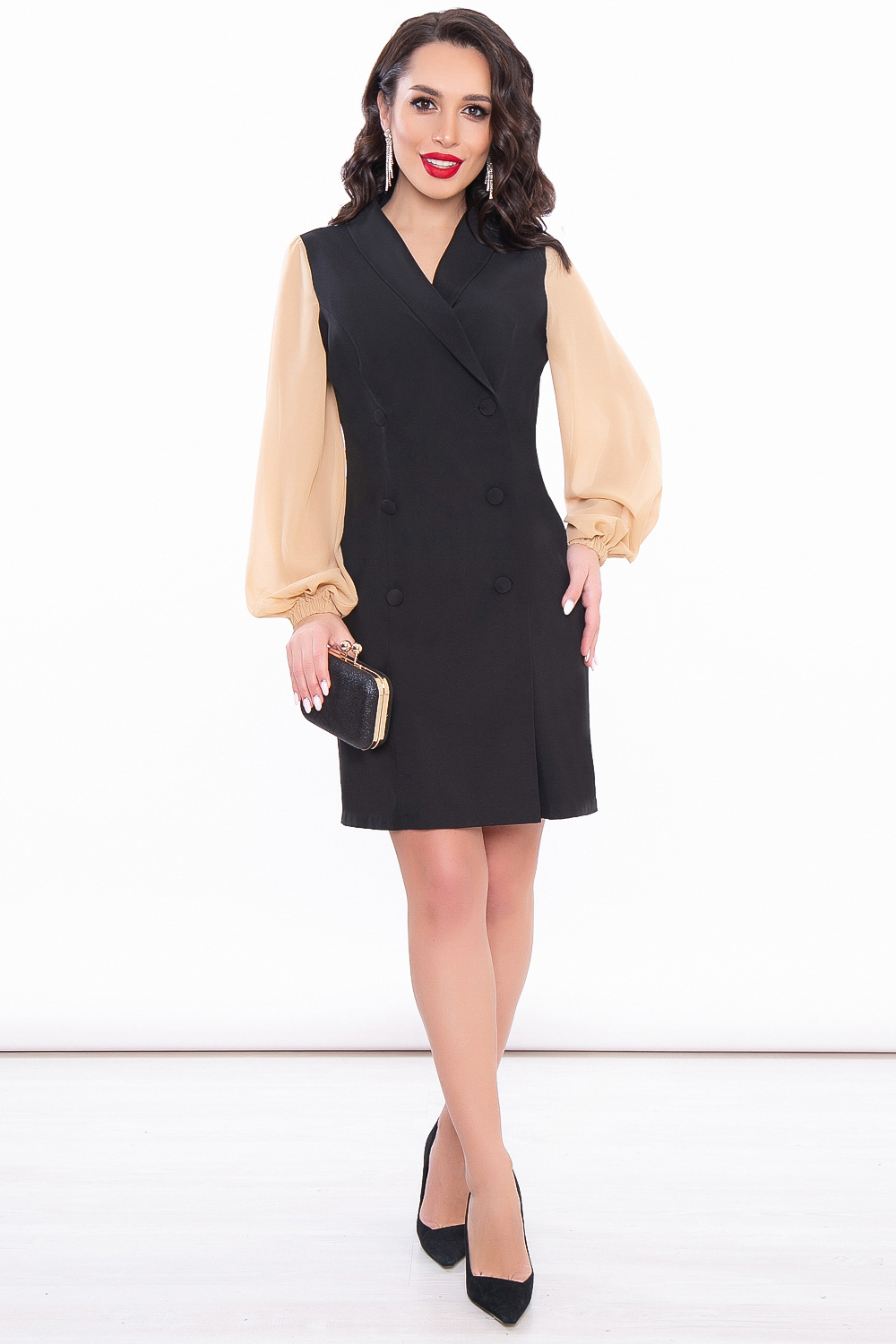 Платье, скроенное по типу двубортного пиджака с контрастными рукавами. Оно имеет очень интересный фасон и помогает создать элегантный, изысканный и одновременно эффектный образ. Округлый вырез горловины, по переду застёгивается на пуговицы, обтянутые основной тканью. Рукав втачной, длинный, выполнен из шифона. Низ на резинке. Платье без замков, без подкладки.