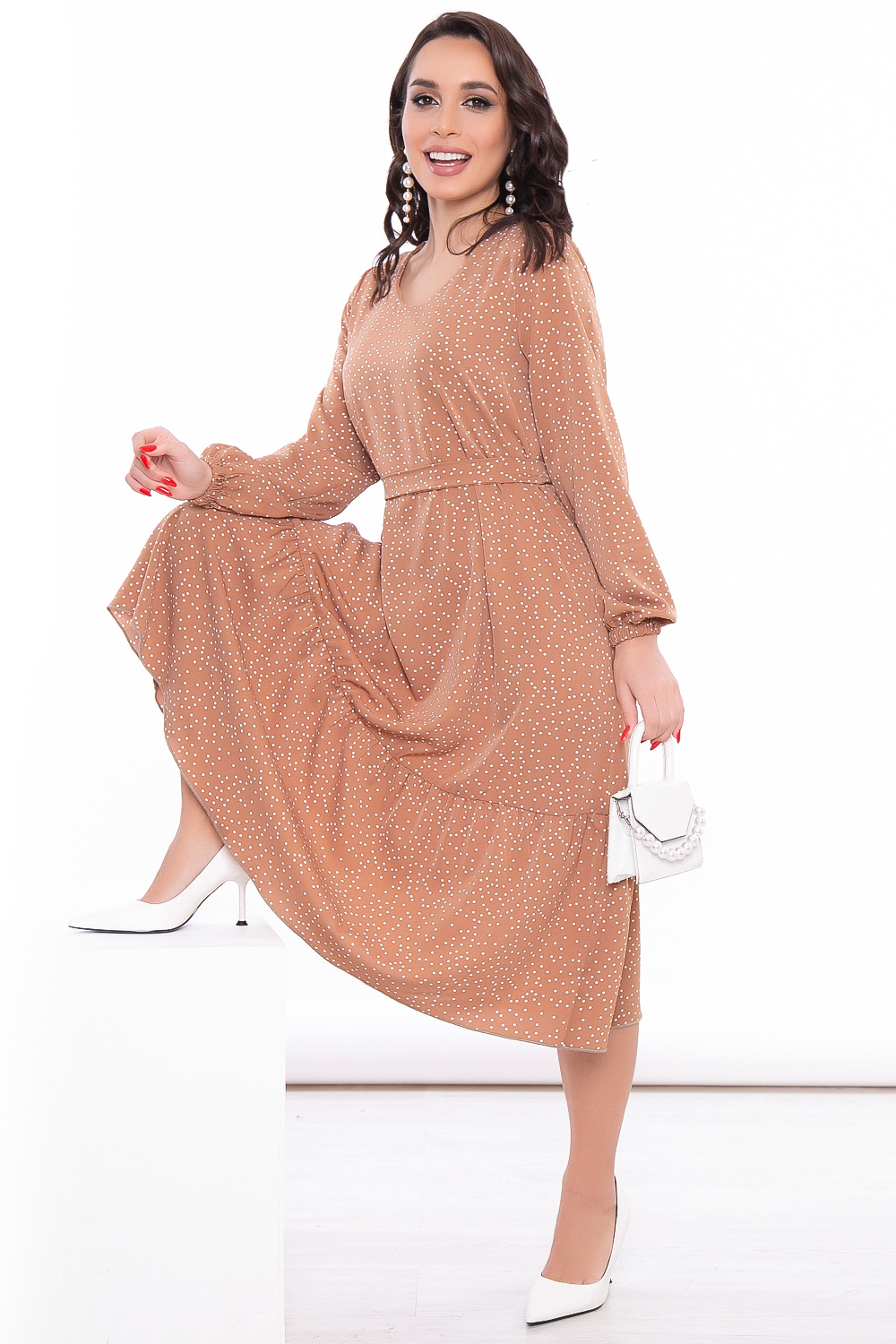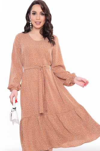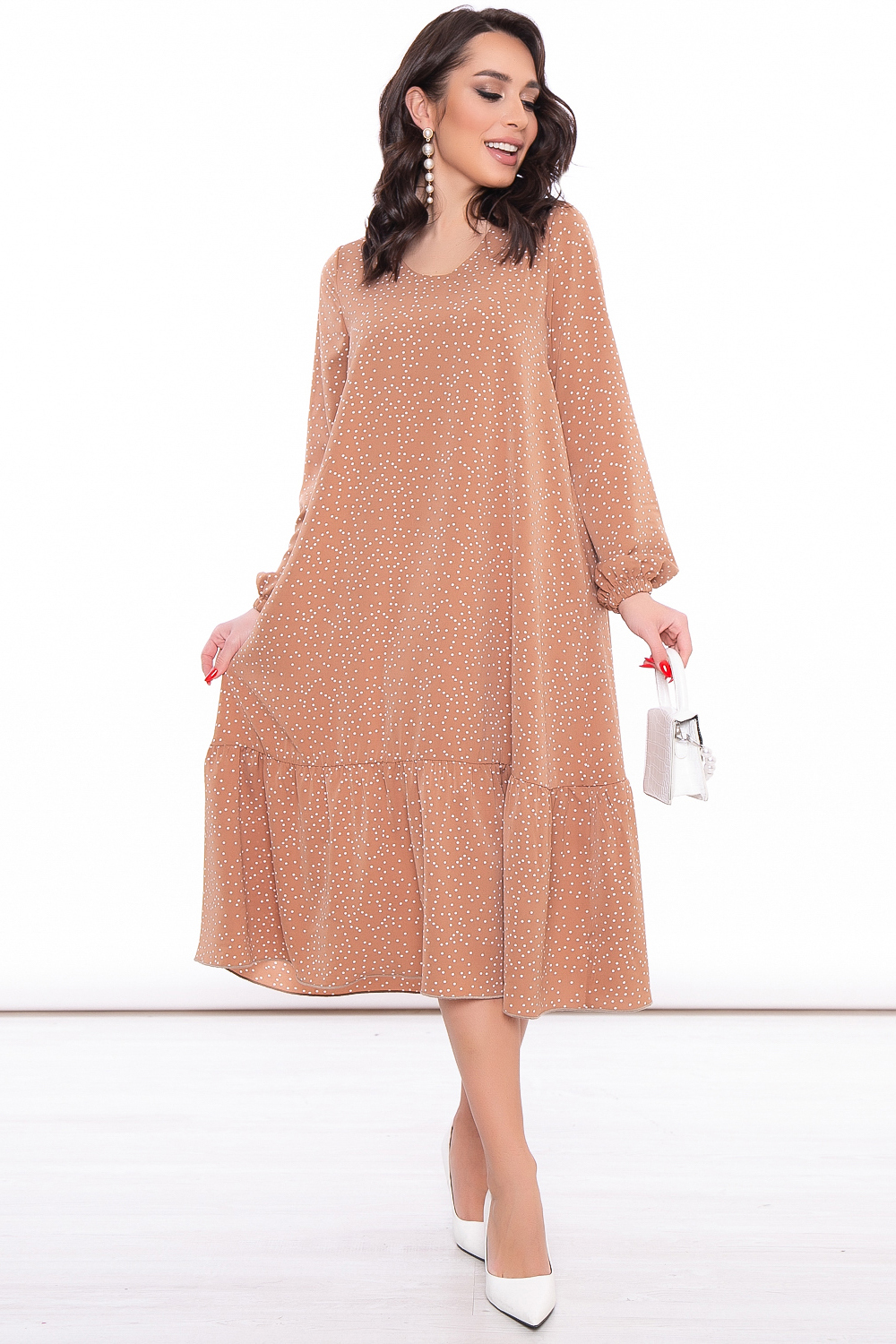 Изящное платье длины миди. Платье подчеркнет хрупкость женской фигуры, сгладит недостатки и зрительно улучшит пропорции. Изящное платье свободного кроя, округлый вырез горловины. Рукав втачной, длинный, низ на резинке. Шикарная, летящая юбка, по низу широкий волан. В комплекте пояс из основной ткани;