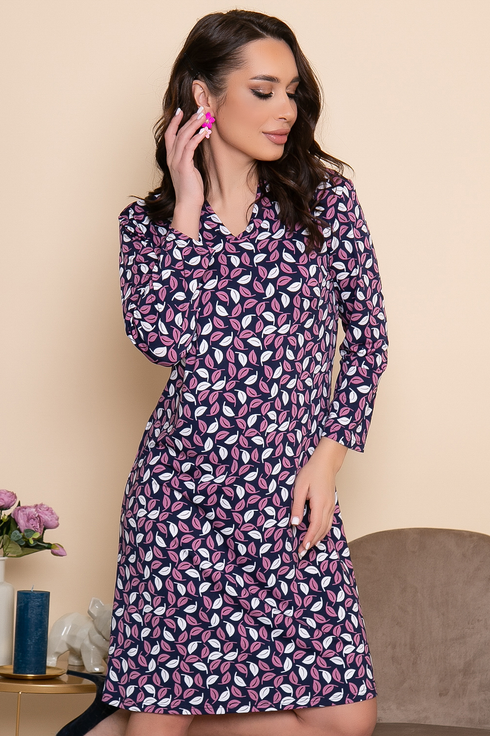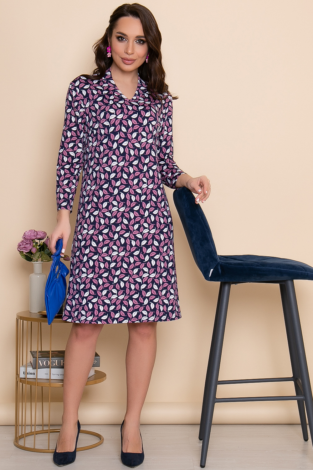- Цвет: синий. Принт: листья (розовый, белый);