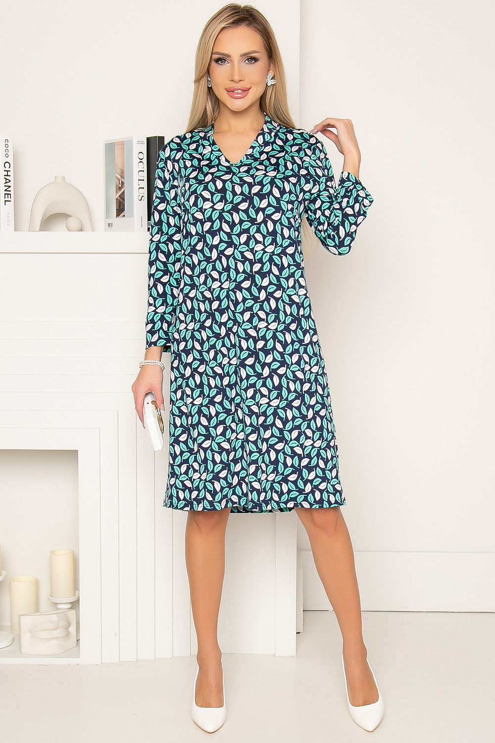 Трикотажное платье с ярким весенним принтом идеально подойдет на каждый день. Платье полуприлегающего силуэта, из приятной к телу ткани. Полуприлегающий силуэт, рукав втачной, удлиненный 7/8. Элегантный шалевый воротничок с мягким V-образным вырезом красиво подчеркнет ключицы и линию шеи.