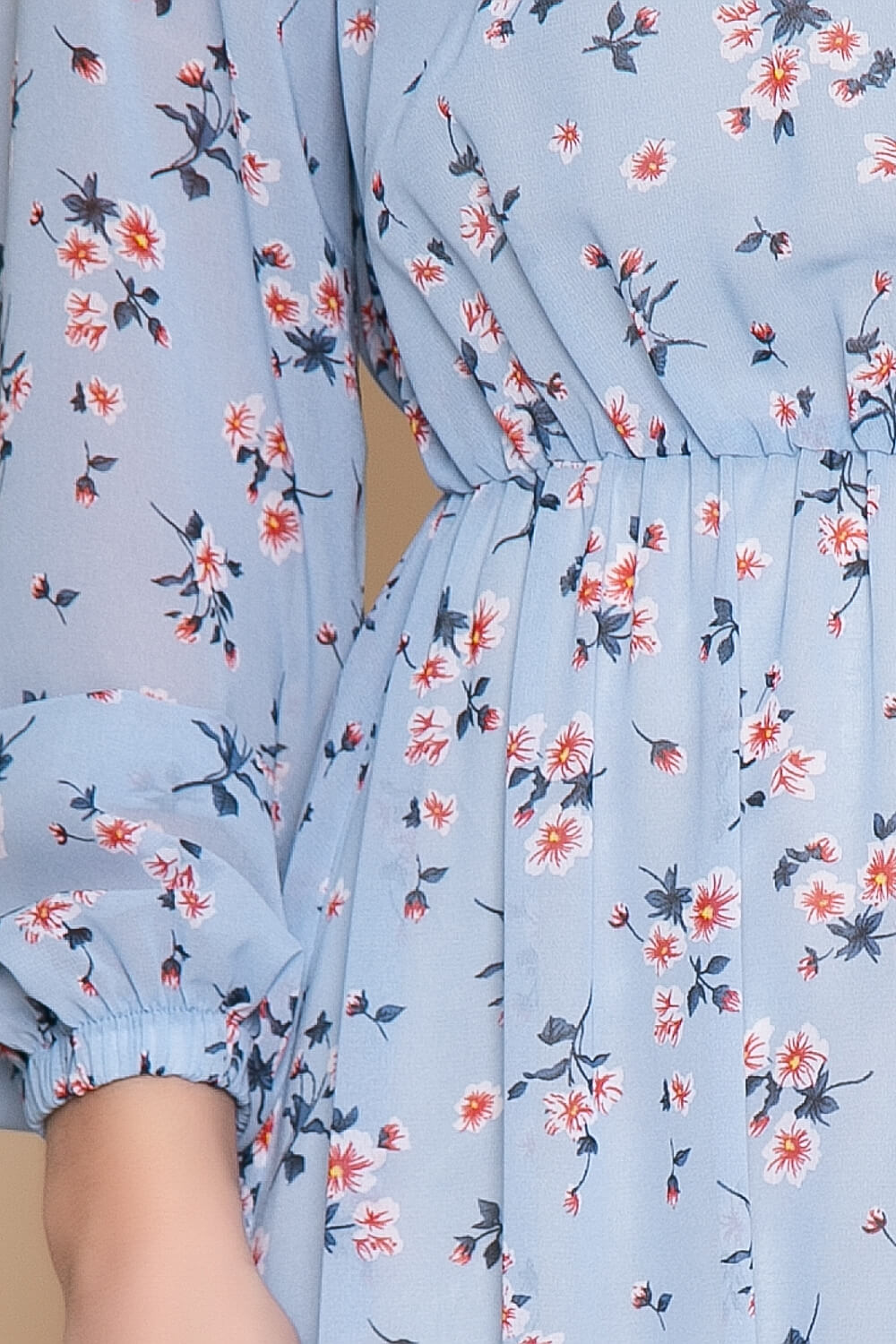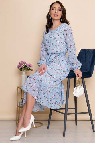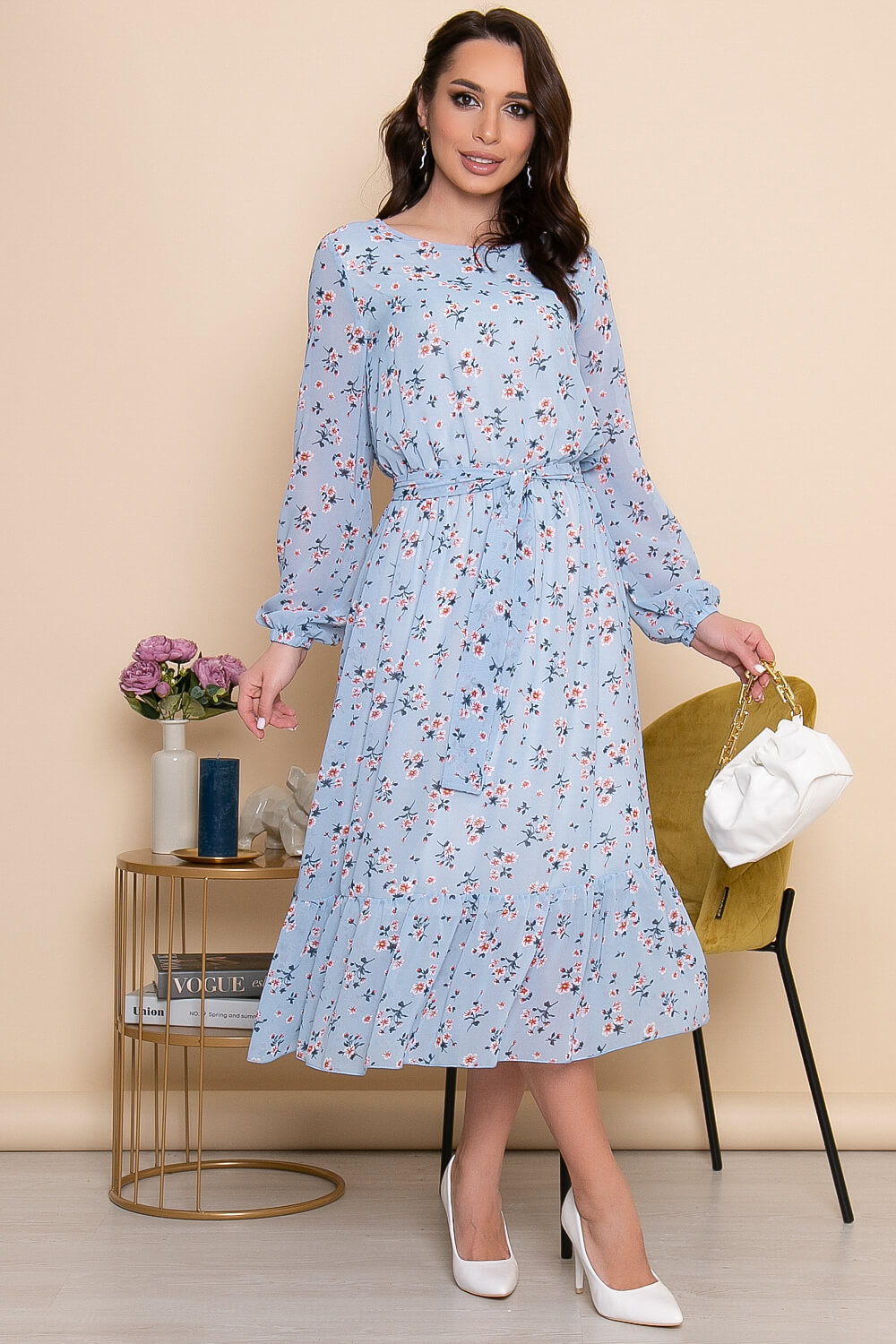 Платье из шифона в невероятном голубом оттенке! Самый женственный фасон платья с цветочным принтом не оставит никого равнодушным к Вашему образу. Платье А-силуэта, талия на резинке. По низу юбки - широкий волан, рукав втачной,длинный, низ на резинке. Горловина - мягкая лодочка. Платье на подкладке, без замков. В комплекте поясок из основной ткани.