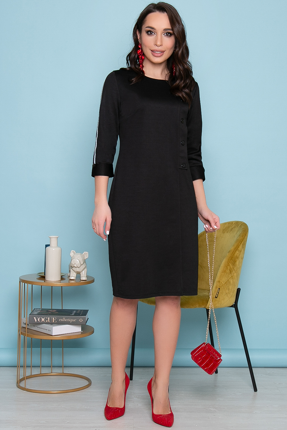 Платье прямого кроя в классическом чёрном оттенке в стиле спорт-шик. Рукав втачной, три четвертых, низ рукава подвернут, украшен пуговицей. Акцент - лампасная лента по рукаву, декоративная планка по переду украшенная пуговицами. Вырез горловины - мягкая лодочка.