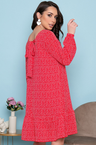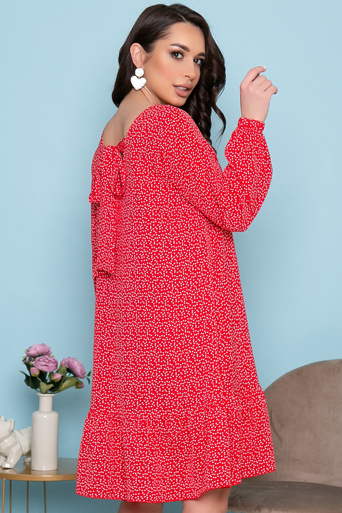 Маленькое платье с акцентом на спинке. Изящный бант создаст лёгкий непринуждённый образ. Платье свободного кроя с широким воланом по низу прекрасно подойдёт на любую фигуру, скрыв её недостатки. Рукав втачной, длинный, низ на резинке.