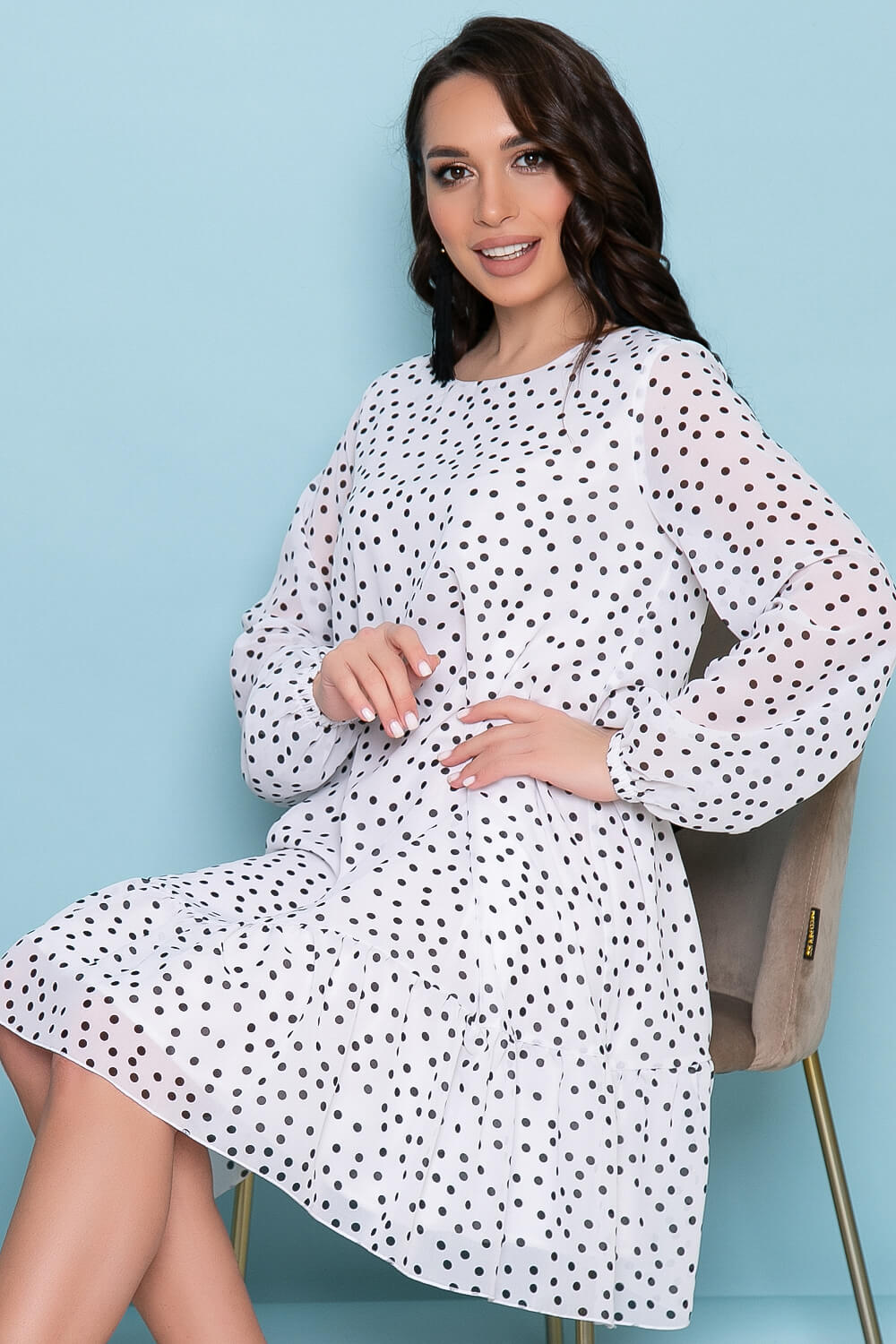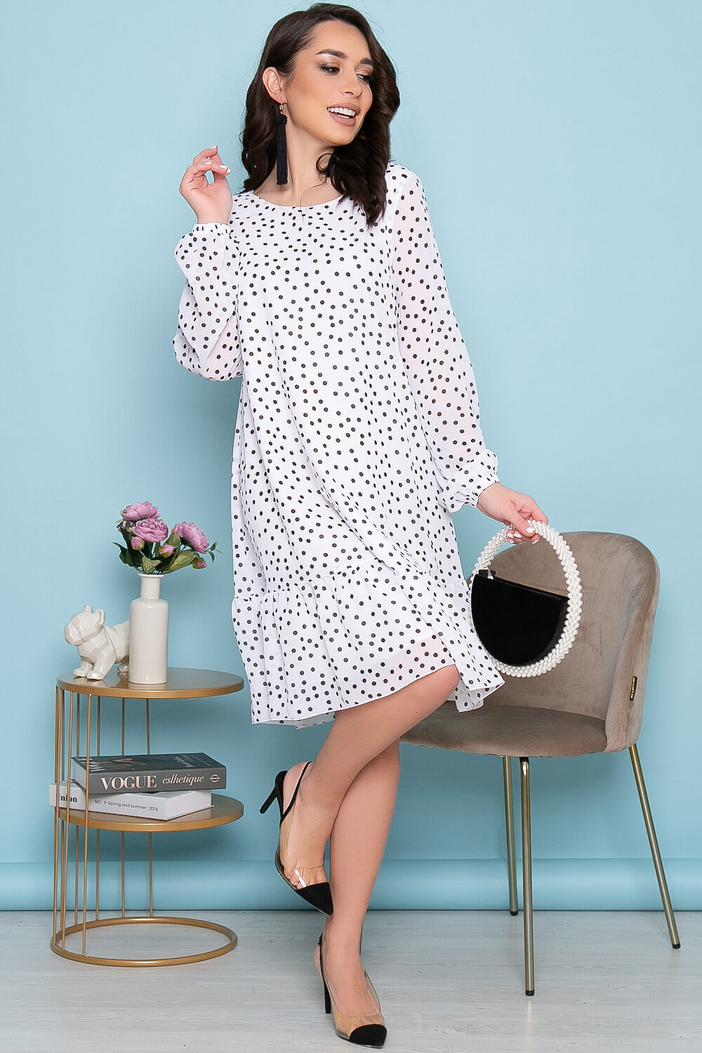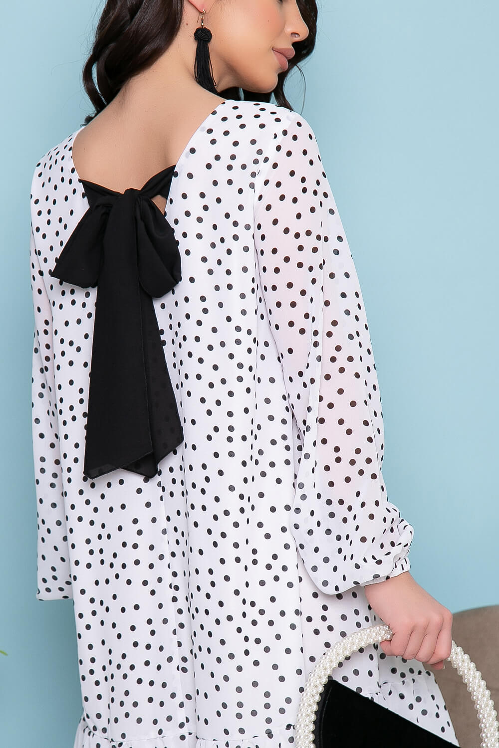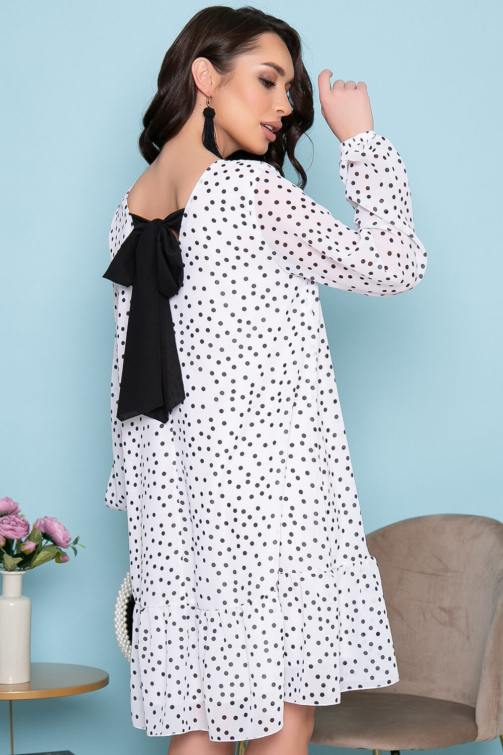 Маленькое платье с акцентом на спинке. Изящный бант создаст лёгкий непринуждённый образ. Платье свободного кроя с широким воланом по низу. Прекрасно подойдёт на любую фигуру, скрыв её недостатки. Рукав втачной, длинный, низ на резинке. Горловина - мягкая лодочка. Платье на подкладке.