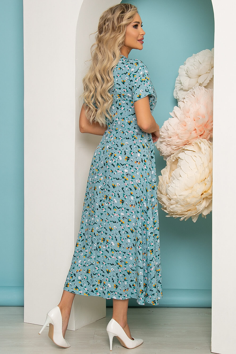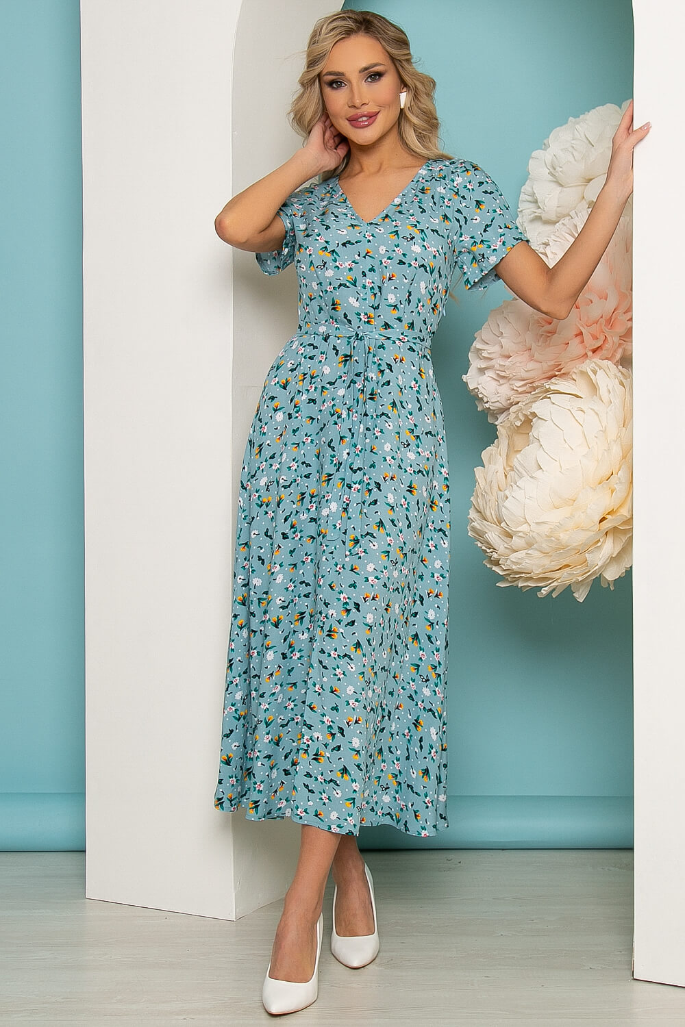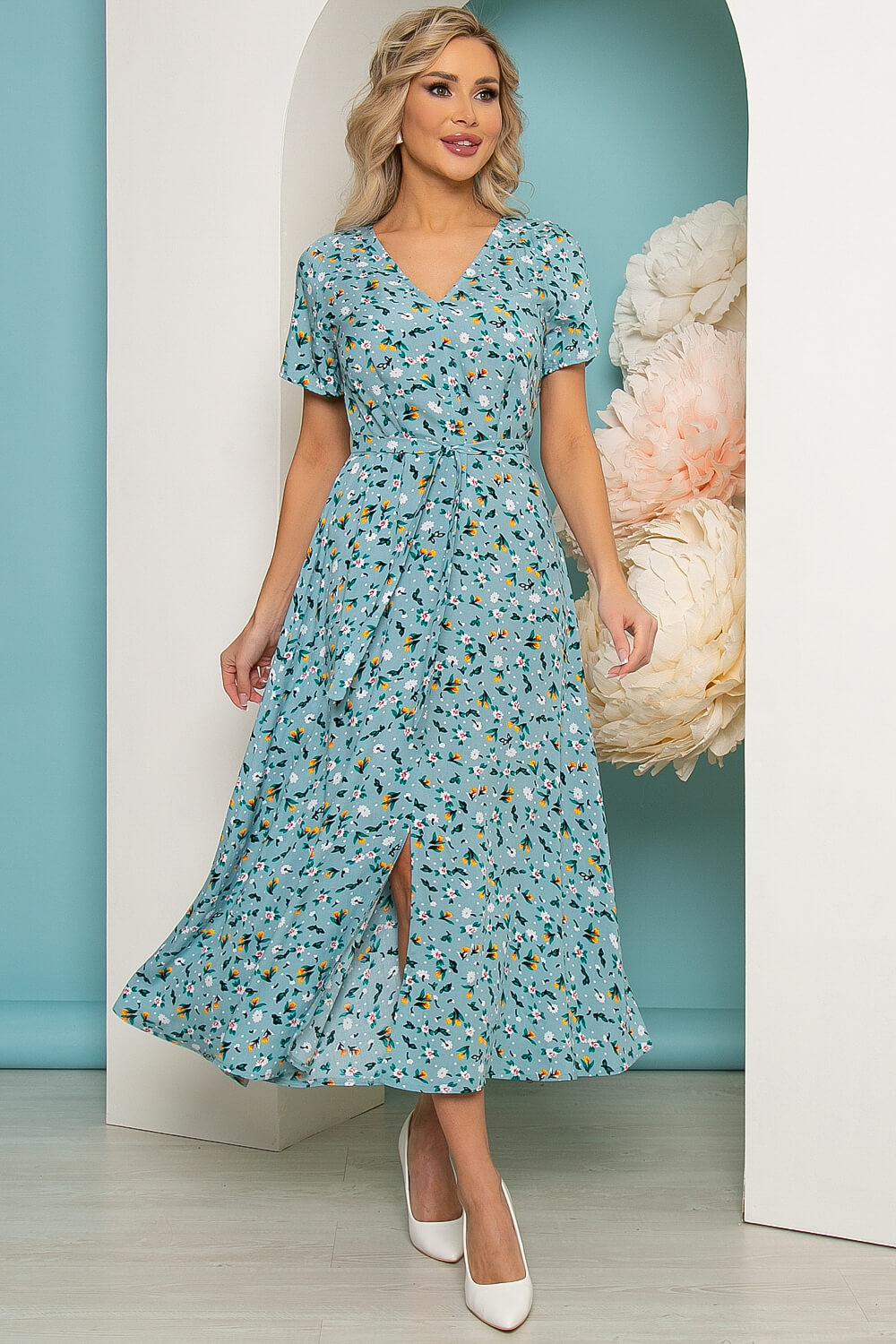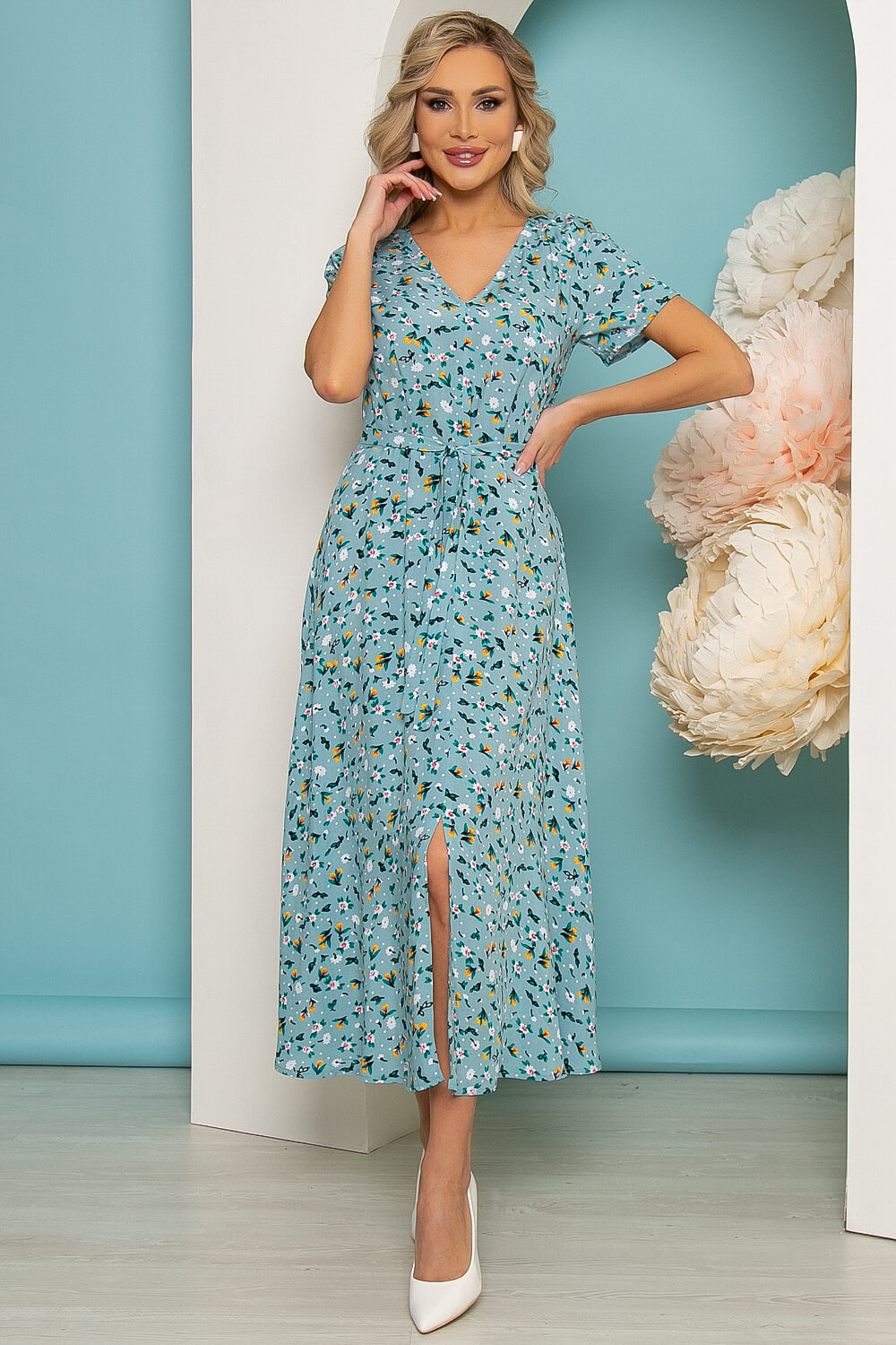 Элегантное платье, которое прекрасно подойдет для прогулки или свидания! Хорошо сочетается с каблучком и с обувью на низком ходу. Хит сезона - платье длины миди из натуральной ткани, с очень популярным сейчас цветочным принтом. Мягкий V-образный вырез красиво подчёркивает шею, тонкий поясок - подчеркнет талию. Небольшой разрез по переду выразительно подчеркнет и удлинит Ваши ножки! В боковом шве потайная молния.