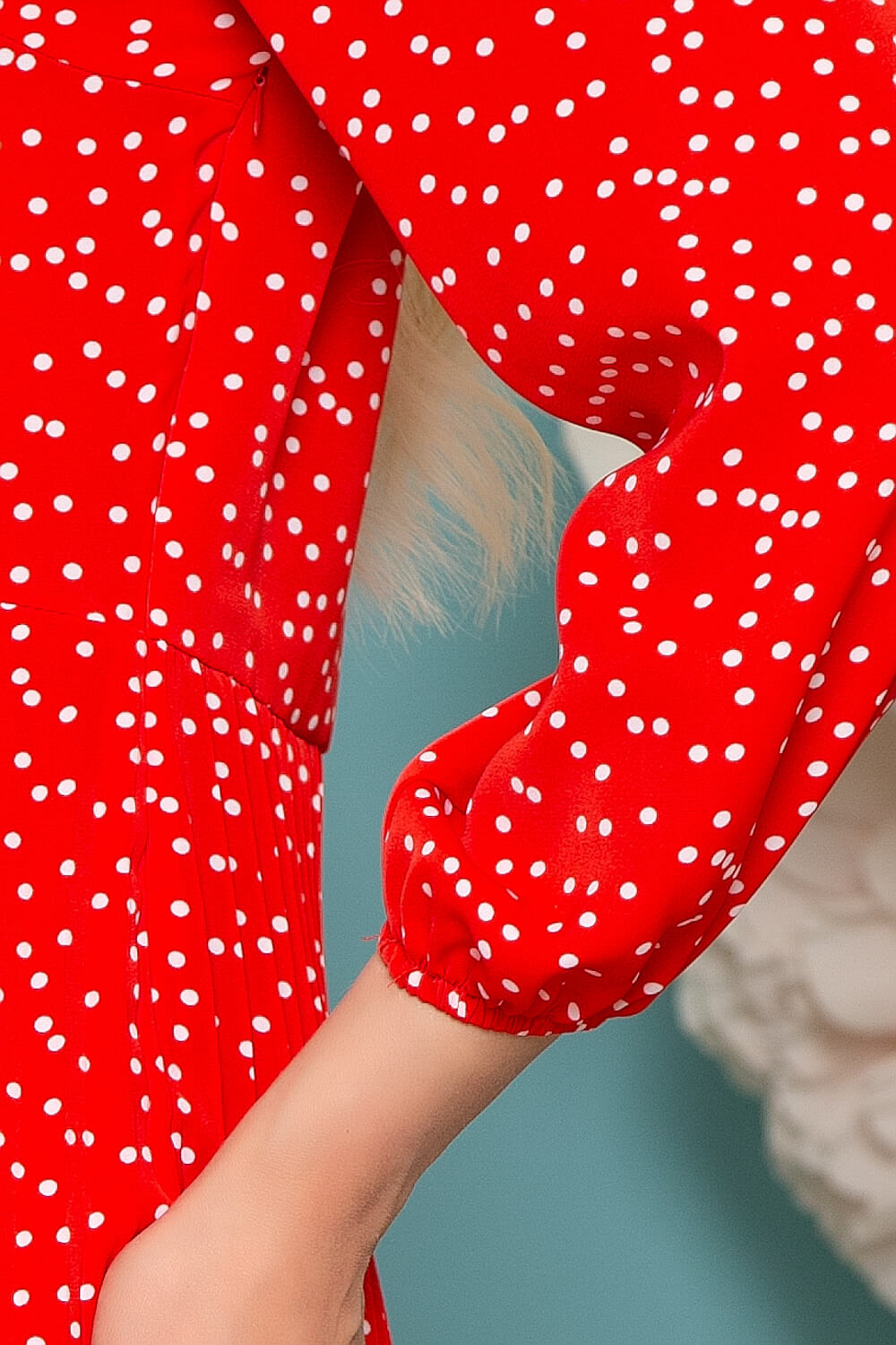 Долгожданный ХИТ продаж в новом исполнении! Летящее, манящее, женственное платье для самых утонченных натур. Плиссированная юбка длины миди,манящий красный цвет, принт в мелкий горошек - залог успешно созданного романтического образа. Талия отрезная, округлый вырез горловины. Рукав втачной, 7/8, низ на резинке. В комплекте поясок из основной ткани с пряжкой. Платье без подкладки, в боковом шве потайная молния.